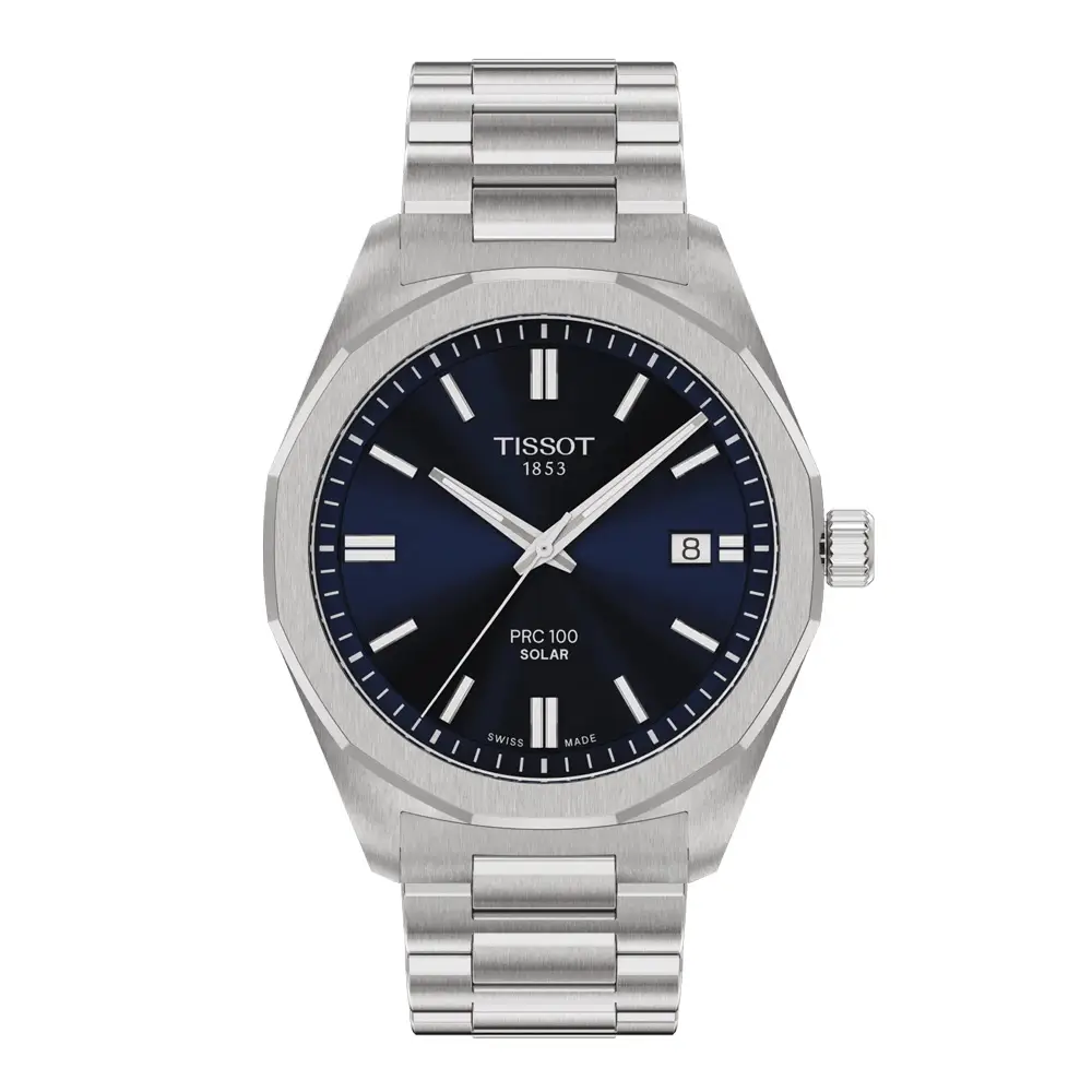 Tissot PRC 100 Solar 39mm T151.422.11.041.00 将瑞士精准与可持续科技完美结合。其 39 毫米 316L 精钢表壳 搭配优雅的蓝色表盘,配有夜光指针与时标。抗刮擦的蓝宝石水晶镜面提供持久清晰度与保护。