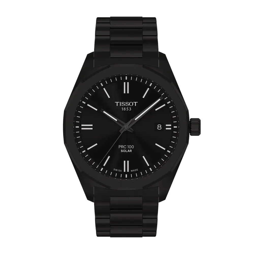 Tissot PRC 100 Solar 39mm T151.422.33.051.00 来自 Tissot,融合现代科技与经典设计。39毫米黑色PVD不锈钢表壳搭配黑色表盘与Super-LumiNova®夜光涂层,确保清晰读时,并由防刮蓝宝石玻璃保护。