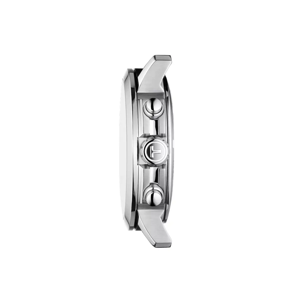 不锈钢表链配折叠扣 与表壳相得益彰,佩戴稳固舒适。具备 200 米(20 巴)防水性能 的 Tissot PRC 200 Chronograph 是活力男士的理想之选,无论商务还是运动皆能胜任。