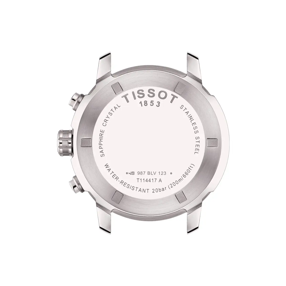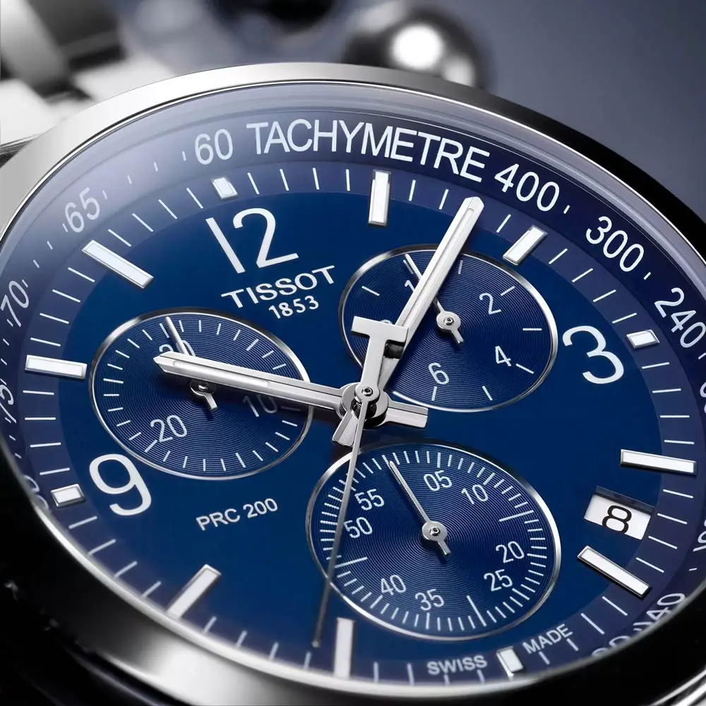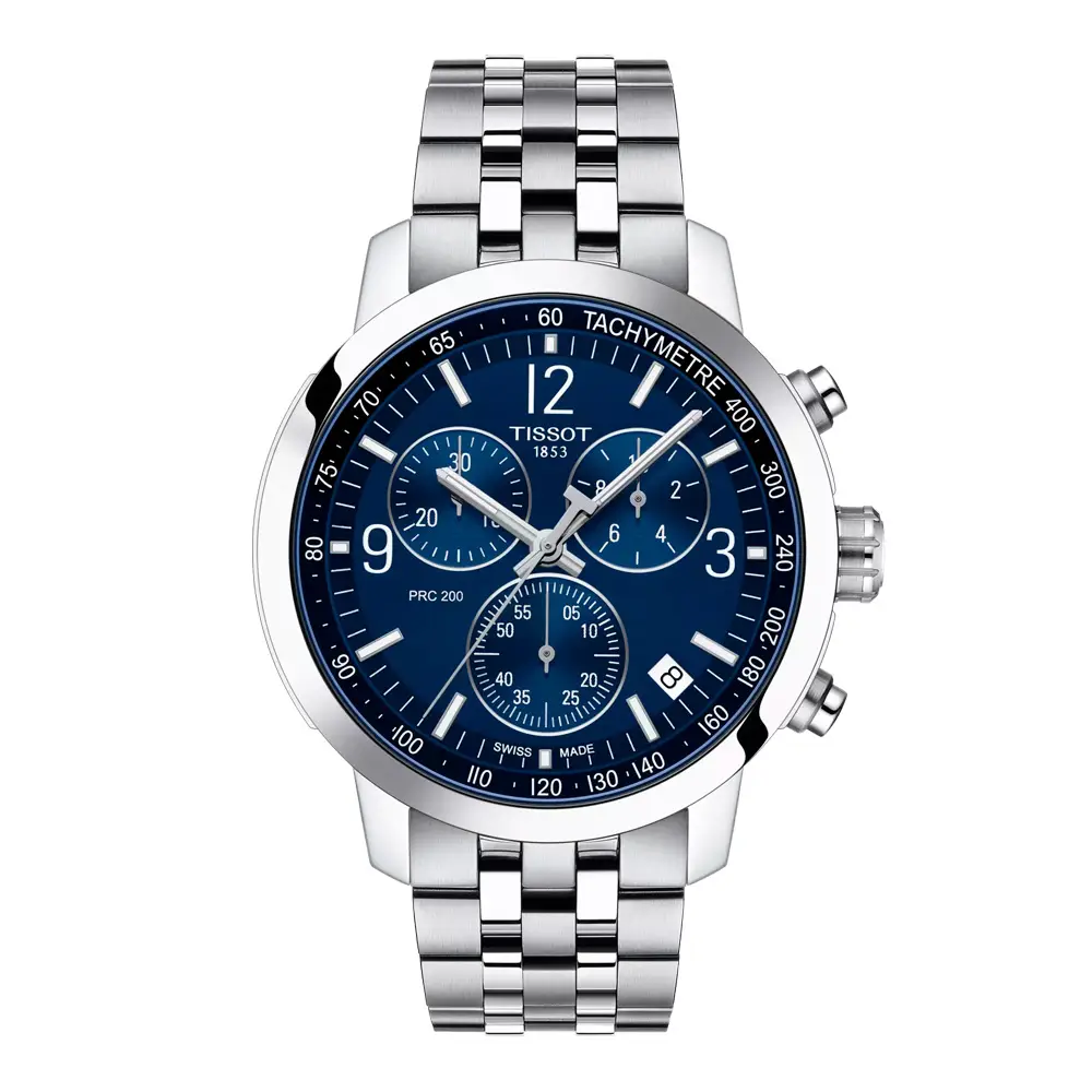 天梭 Tissot PRC 200 Chronograph T114.417.11.047.00 融合了 运动优雅、强劲性能与瑞士精准。43 毫米不锈钢表壳 搭配 蓝色表盘,配有 三眼计时盘、夜光指针与刻度,在弱光环境下也能清晰读时。