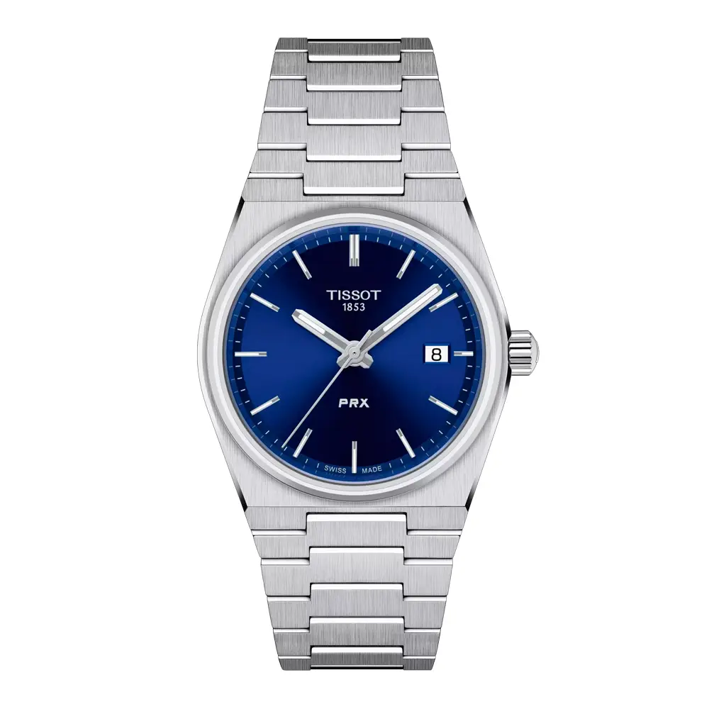 Tissot PRX 35mm T137.210.11.041.00 重新演绎了 1970 年代标志性复古设计的现代魅力。35 毫米 316L 不锈钢表壳 搭配 防刮擦蓝宝石镜面,保护着 蓝色太阳纹表盘,展现深邃与优雅。银色时标与 Super-LumiNova® 夜光指针 确保出色的读时体验。