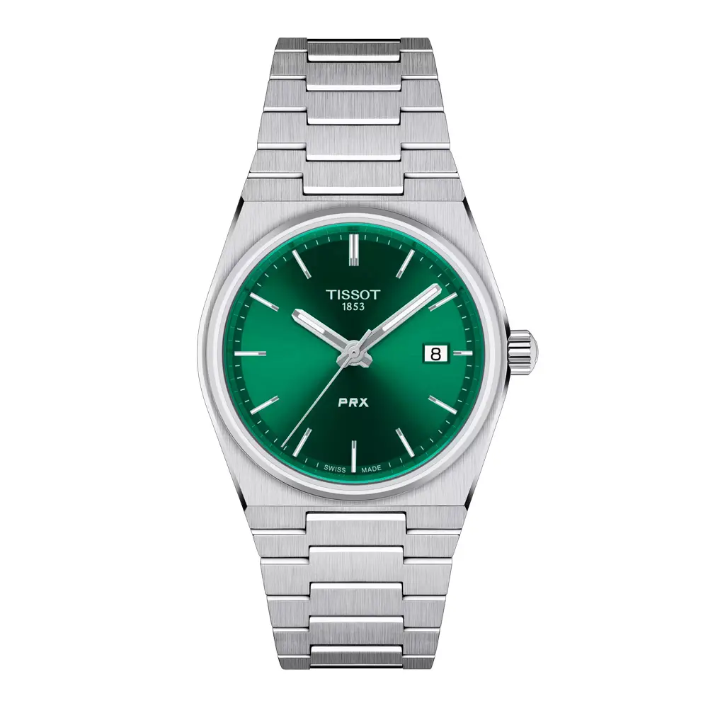 天梭PRX 35毫米,型号T137.210.11.081.00,是一款将复古风格与现代技术相结合的优雅腕表。这款腕表的表壳直径为35毫米,采用不锈钢材质,配有绿色太阳纹表盘。腕表采用不锈钢一体式表链,配有快拆系统,方便更换表带。