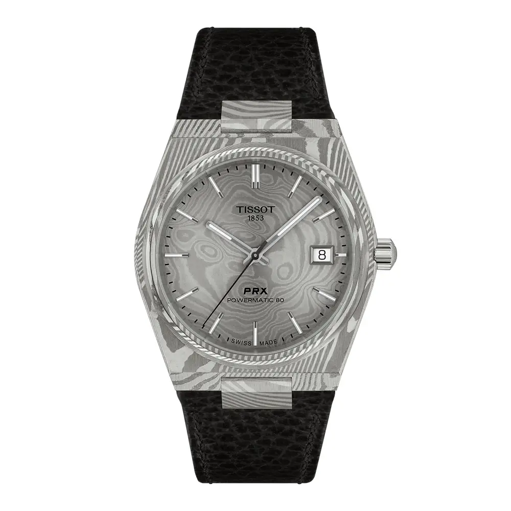 Tissot PRX Powermatic 80 Damascus Steel 腕表将 PRX 系列的标志性复古设计与现代制表工艺完美结合。该型号的亮点在于 38 毫米大马士革钢表壳,其独特纹理使每一枚腕表都独一无二。灰色表盘搭配精致时标、夜光指针与日期显示,整体简洁而均衡,防眩光蓝宝石水晶镜面则确保出色的读时清晰度。