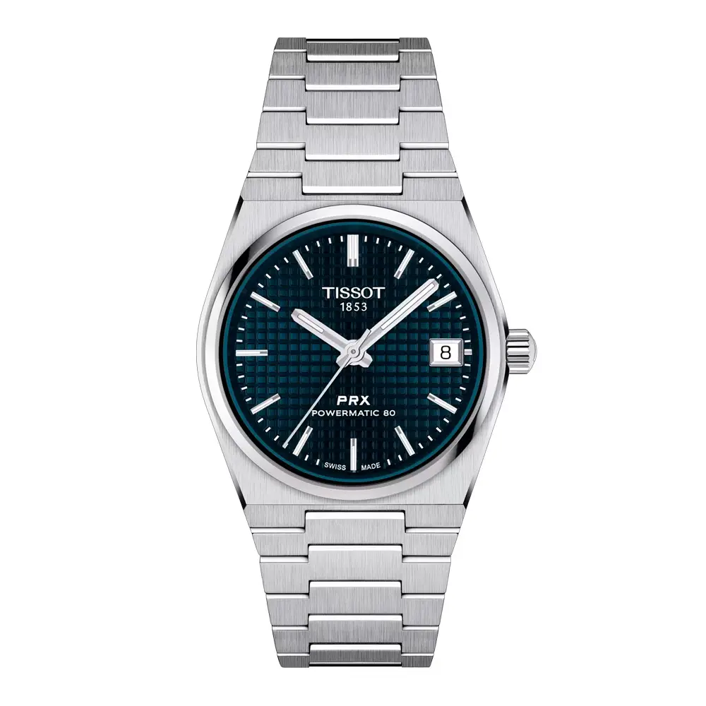 Tissot PRX Powermatic 80 35mm T137.207.11.041.00 结合了 优雅比例、机械性能与标志性 PRX 设计。35 毫米 316L 不锈钢表壳 搭配 防刮擦蓝宝石镜面,蓝色纹理表盘 配有 夜光指针 及 3 点位置日期窗,展现出平衡且百搭的美感。