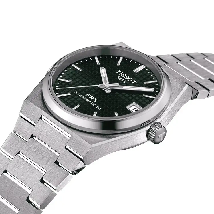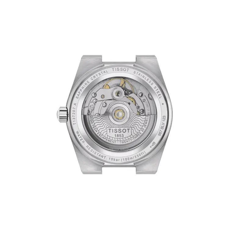 腕表搭载 Powermatic 80 自动机芯,提供 80 小时动力储存,可透过 透明蓝宝石底盖 欣赏其精密结构。具备 100 米防水性能 (10 ATM),并配备 抛光与拉丝不锈钢表链 和 带按钮的蝴蝶扣。Tissot PRX Powermatic 80 35mm 诠释了 复古美学、现代性能与瑞士制表精髓 的完美融合。