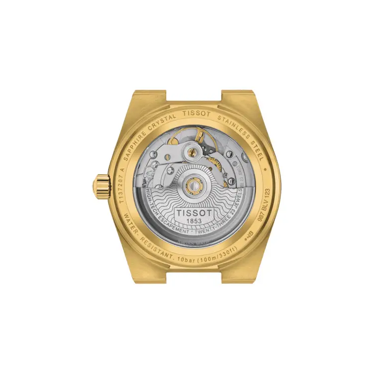 Tissot PRX Powermatic 80 35mm T137.207.33.021.00 将现代优雅与瑞士制表精度完美结合。直径 35 毫米的不锈钢圆形表壳,镀黄色金,配备坚固的 蓝宝石水晶镜面,下方是 金色纹理表盘。3 点钟位置的日期显示 增添了实用性。