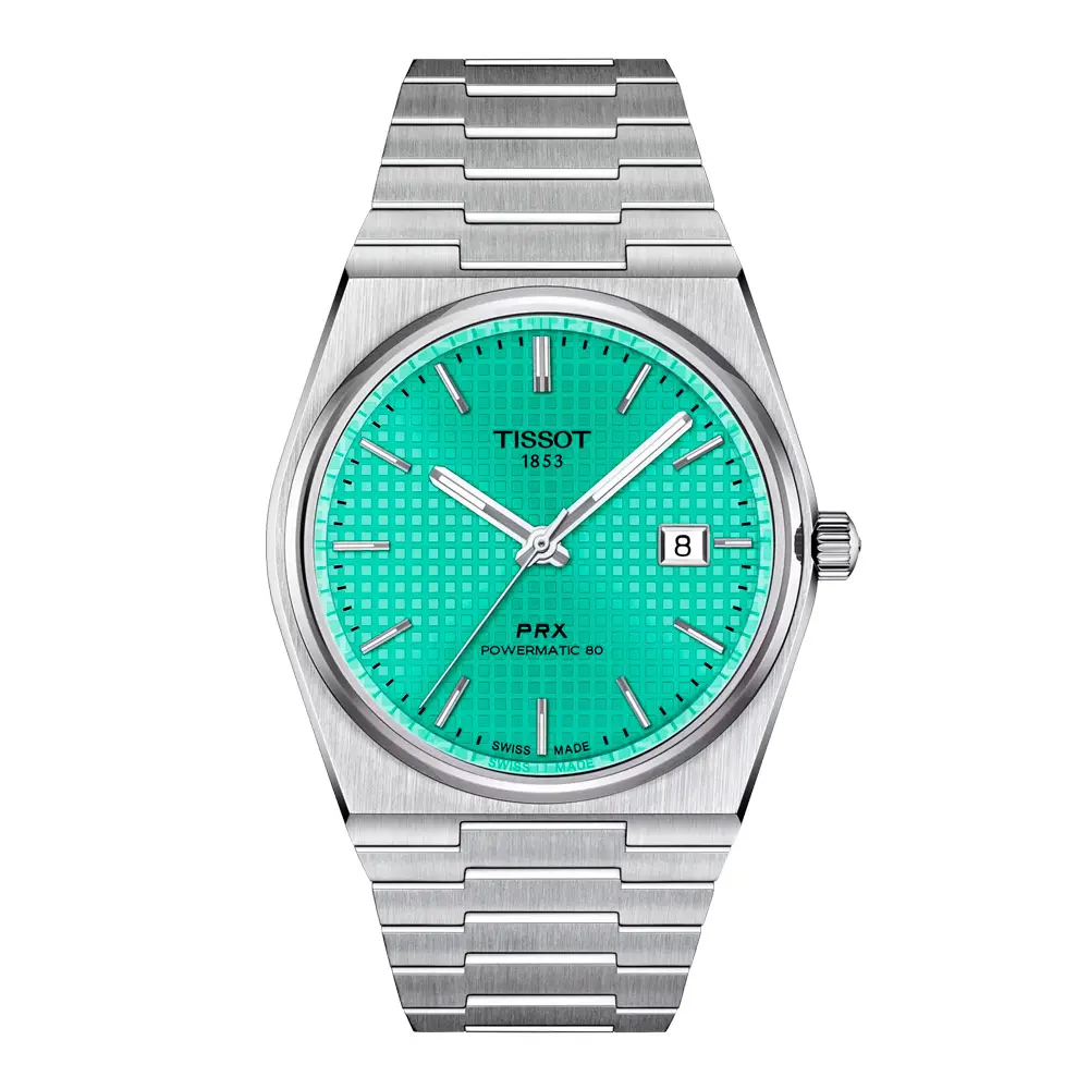 天梭 PRX Powermatic 80 40 毫米绿松石款是对 1970 年代标志性设计的现代诠释,融合了永恒美学与最新的瑞士制表技术。40 毫米不锈钢圆形表壳搭配优雅的钢质表圈,并由耐刮擦蓝宝石玻璃保护,确保高强度防刮与清晰读时。