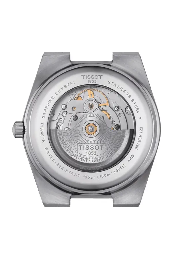 腕表搭载 自动上链 Powermatic 80 机芯,拥有 80 小时动力储存,并配备 Nivachron 游丝,提高抗磁性与走时精准度。透明底盖 展示精美的机芯打磨工艺,体现天梭对品质与细节的执着。