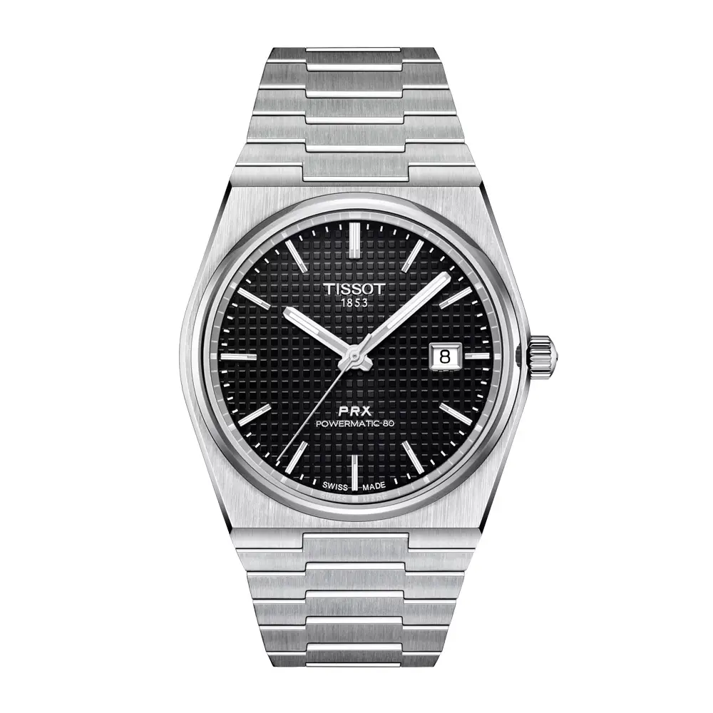 天梭 Tissot PRX Powermatic 80 T137.407.11.051.00 将 现代优雅与瑞士精准 完美融合,设计灵感源自 1970 年代。40 毫米不锈钢表壳 搭配 一体式表链,展现运动与精致并存的风格。黑色垂直拉丝表盘 由 防反光蓝宝石水晶镜面 保护,确保清晰与耐用。