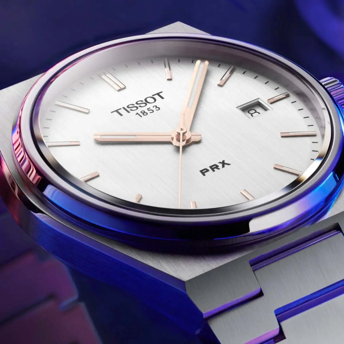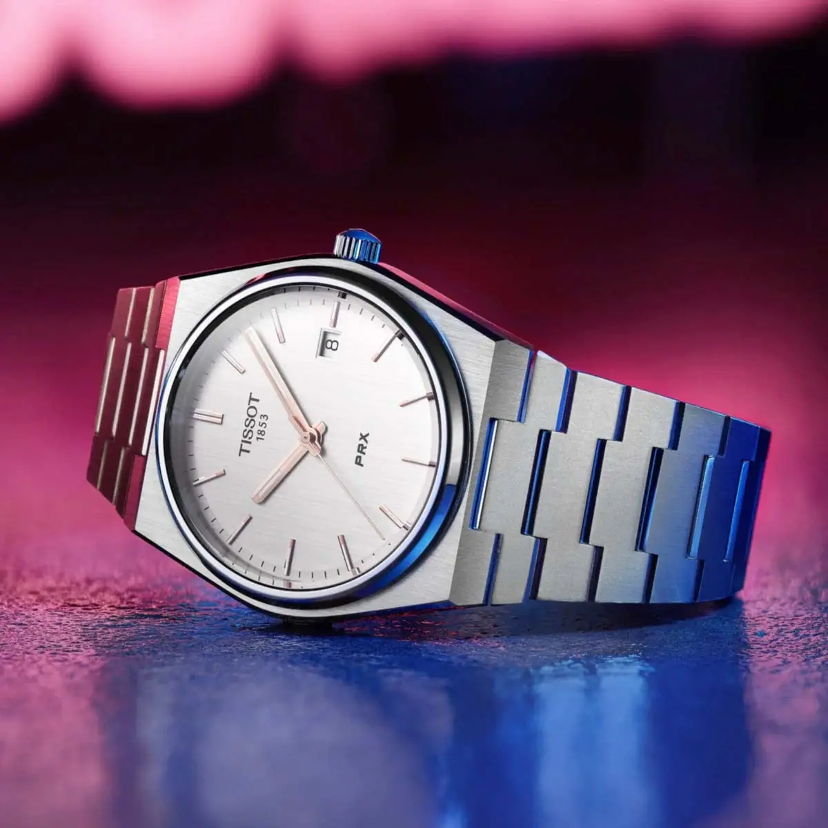 天梭 Tissot PRX T137.410.11.031.00 将 1970 年代的复古优雅与现代瑞士精准工艺 完美融合。40 毫米不锈钢表壳 搭配 一体式表链,展现出永恒而时尚的格调。银色垂直拉丝表盘 配以 抛光时标与夜光指针,防反光蓝宝石水晶镜面 提供出色的耐用性与清晰度。