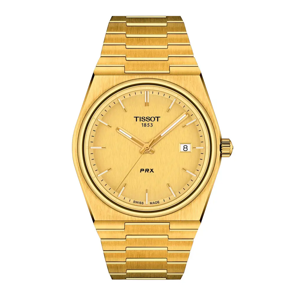 天梭 Tissot PRX Quartz 40mm 奢华金色款,完美融合了永恒的优雅与现代的实用功能。腕表配备 40 毫米不锈钢表壳,覆以黄色 PVD 镀金,搭配 高强度防刮蓝宝石玻璃镜面,提供卓越的耐磨保护。
