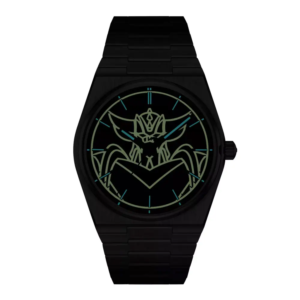 天梭 PRX UFO Robot Grendizer 手表将 70 年代的标志性设计与向传奇动漫人物 Grendizer 致敬的独特风格融为一体。40 毫米精钢表壳搭配一体式表链,延续了 PRX 的标志性造型。在微妙渐变的蓝色表盘上,Grendizer 的轮廓在黑暗中闪闪发光,这要归功于Super-LumiNova® 技术,而"Harken "风格的秒针则指的是这位英雄的著名武器。
