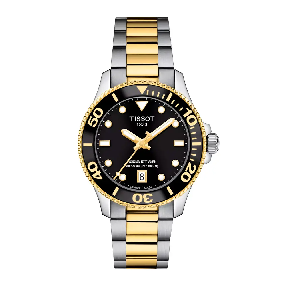 这款 天梭 Tissot Seastar 1000 36mm T120.210.22.051.00 结合了 潜水性能、瑞士精度与优雅设计,以紧凑尺寸展现出非凡风格。36毫米316L不锈钢表壳 搭配 双色黄金PVD镀层,配有 黑色表盘及夜光指针与刻度,在水下依然清晰易读。