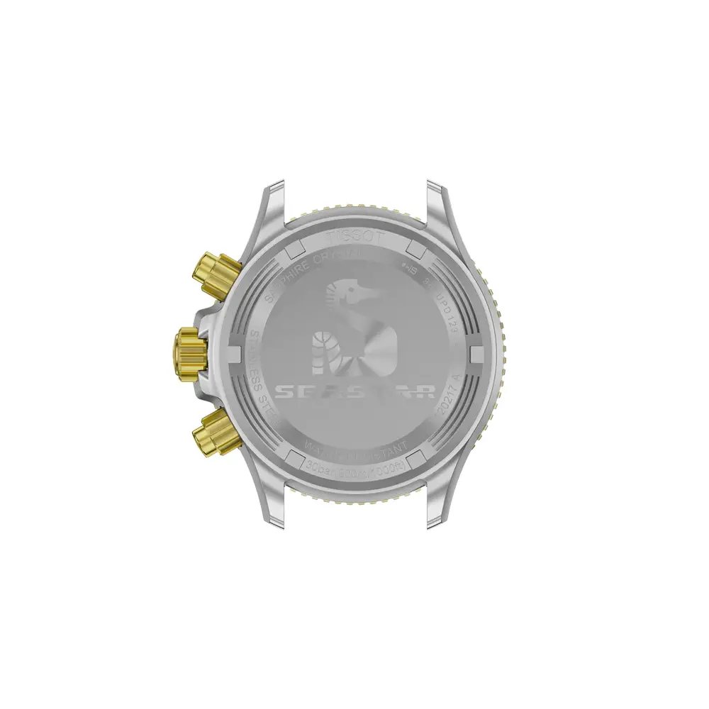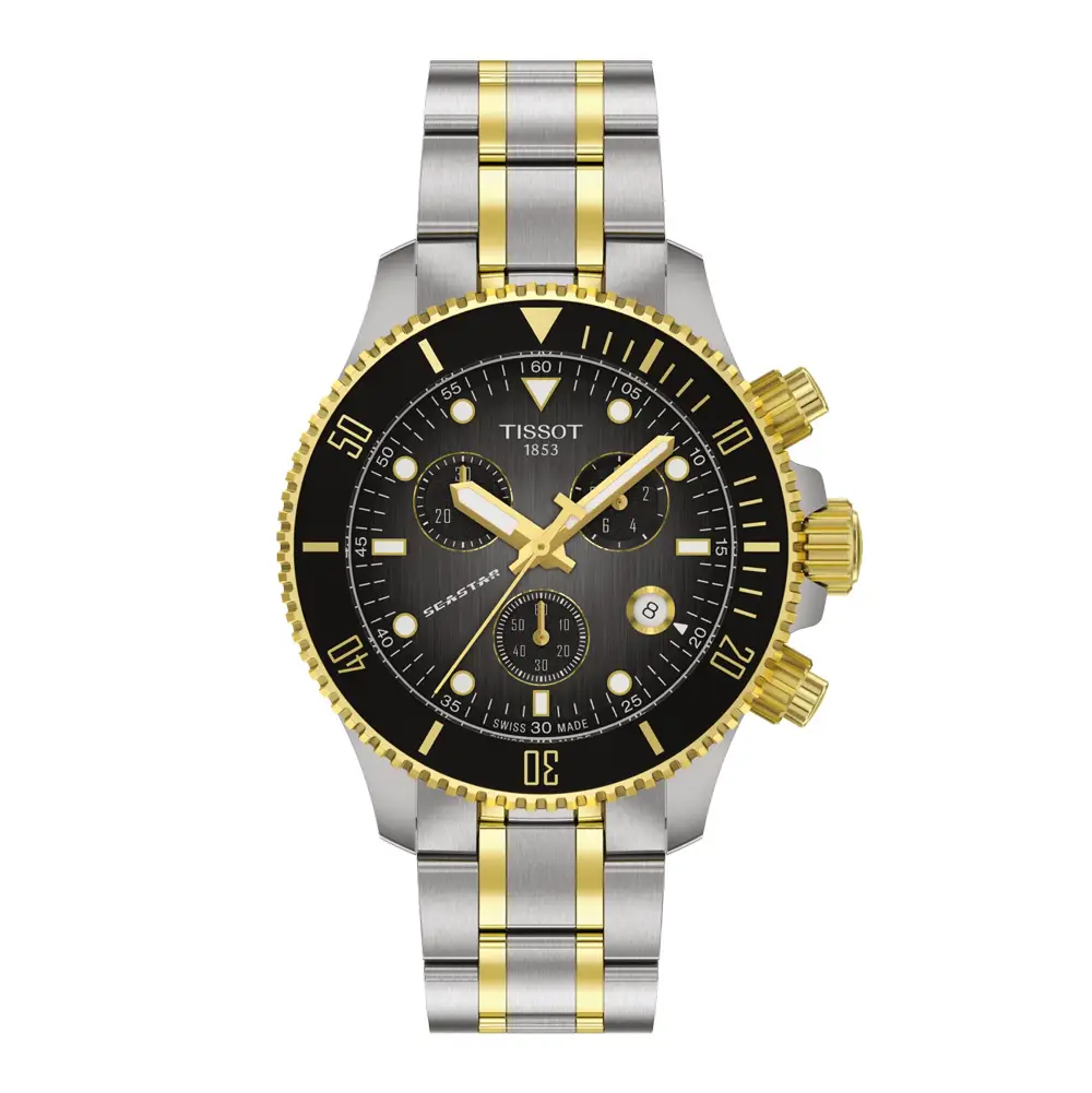 Tissot Seastar 1000 Chronograph T120.217.22.061.00 将 专业潜水性能、耐用性与瑞士精准度 融合于 38 毫米钢制表壳 中。双色 PVD 钢表链 与 灰色表盘 兼具运动感与日常百搭性。