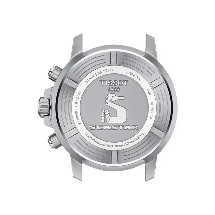 Tissot Seastar 1000 Chronograph T120.417.11.051.01 是一款 坚固而优雅的男士腕表,完美融合了 运动性能与瑞士精密工艺。其 45.5 毫米不锈钢表壳 配备 单向旋转铝质表圈 和 旋入式表冠,具备 300 米(30 bar)防水性能。防刮蓝宝石镜面带防眩光涂层,保护黑色表盘并确保在任何环境下的清晰可读性。