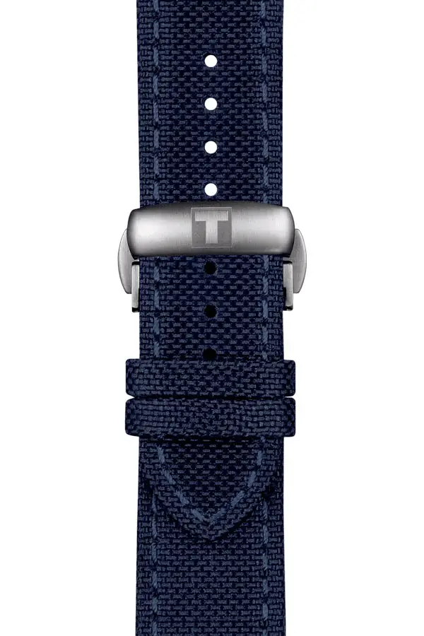 搭载 Powermatic 80.811 自动机芯,拥有 约 80 小时动力储备 与 25 颗红宝石轴承,象征着 精准与可靠性。搭配 蓝色织物表带 与 折叠式表扣,佩戴舒适且安全。