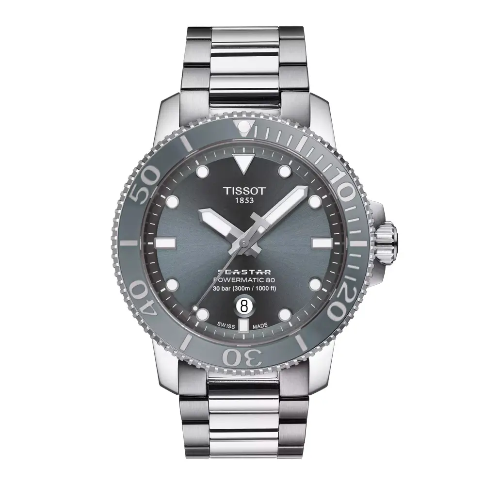 天梭 Tissot Seastar 1000 Powermatic 80 T120.407.11.081.01 结合了 运动优雅、卓越性能与瑞士精准工艺。43 毫米不锈钢表壳 搭配 灰色渐变放射纹表盘,配有 夜光指针与刻度,在水下依然清晰可读。陶瓷单向旋转表圈 与 旋入式表冠 彰显专业潜水表特质。