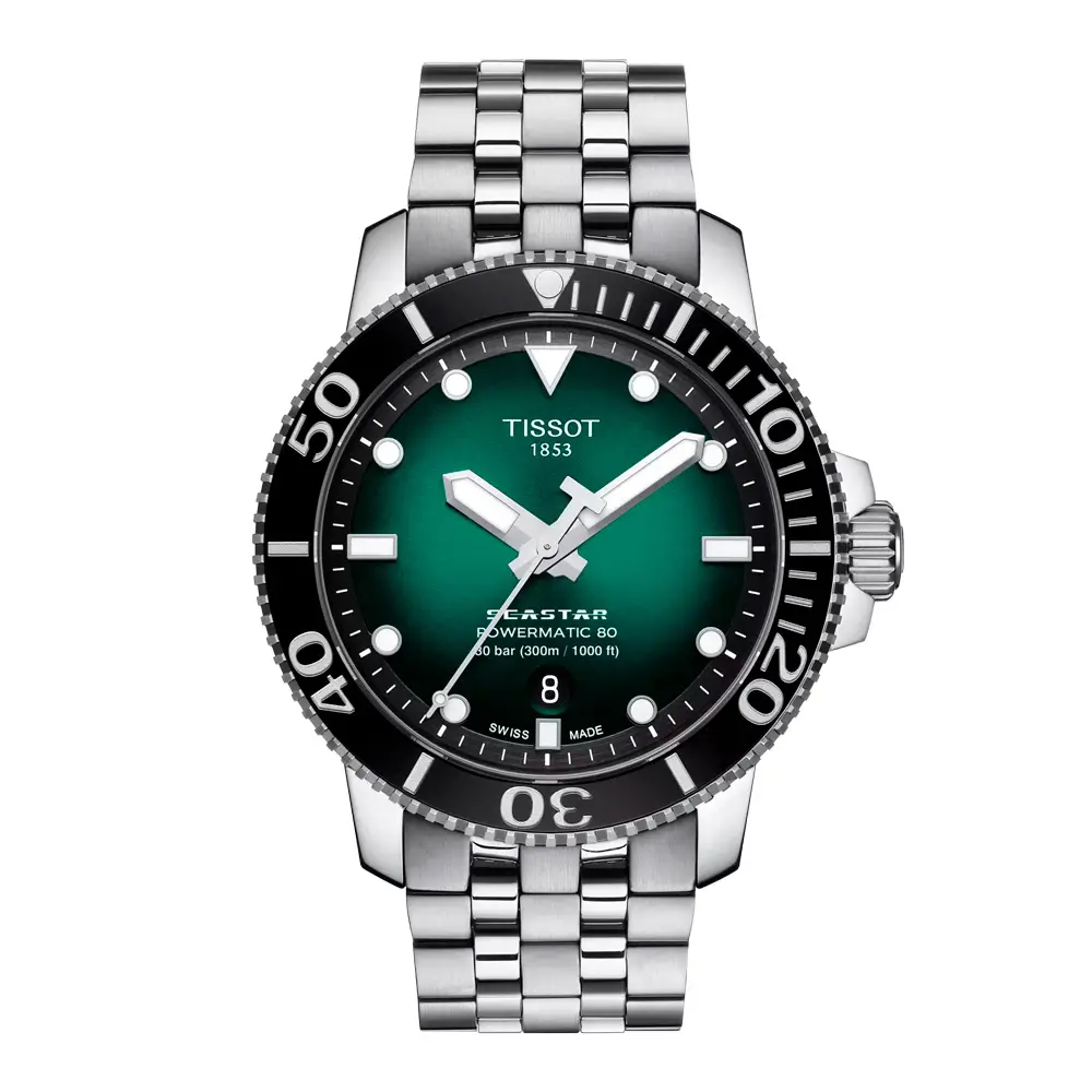 Tissot Seastar 1000 Powermatic 80 是一款男士自动腕表,专为水上运动爱好者与优雅风格爱好者设计。腕表采用 43 毫米不锈钢表壳、绿色渐变表盘,搭配夜光指针与时标,以及 单向旋转陶瓷表圈。旋入式表冠与 300 米防水性能使其非常适合潜水与严苛环境。