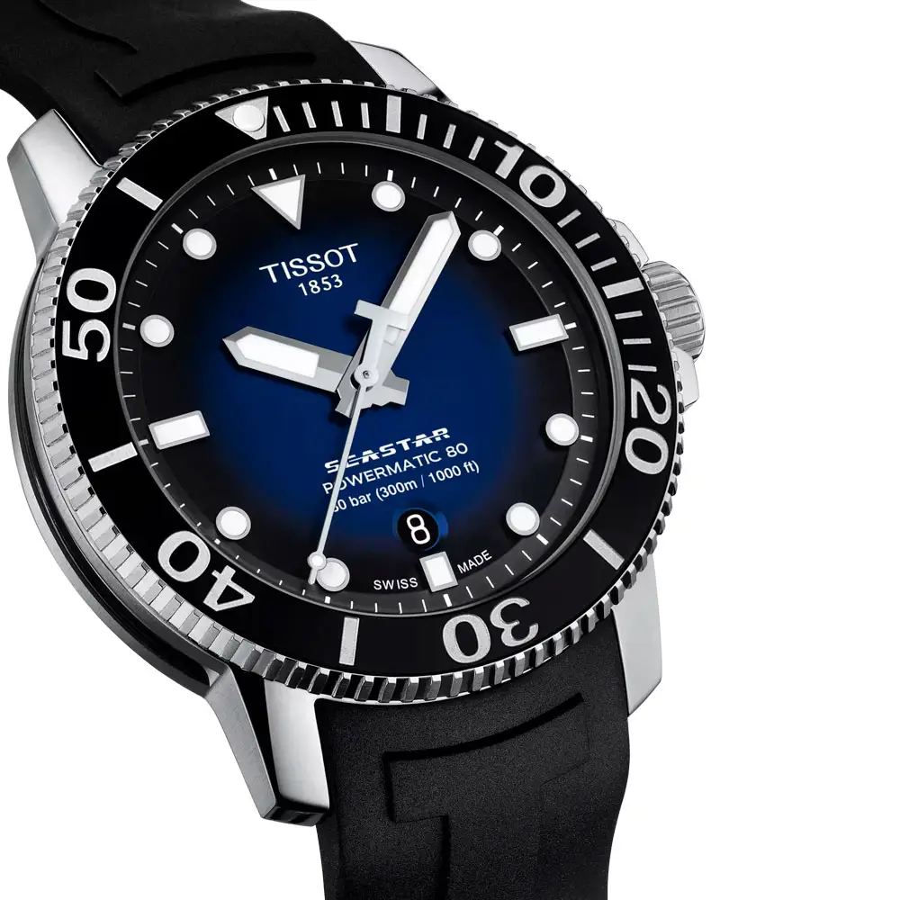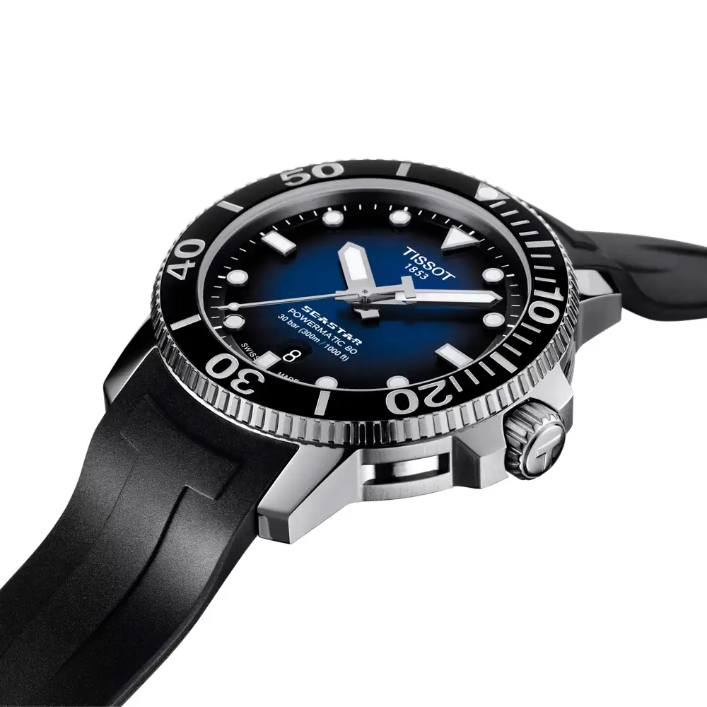 蓝色橡胶表带 佩戴舒适,适合各种水上活动。具备 300 米(30 巴)防水性能 的 天梭 Seastar 1000 Powermatic 80 T120.407.17.041.00 是追求 风格、可靠性与卓越性能 男士的理想之选,无论陆地还是海洋皆完美适用。