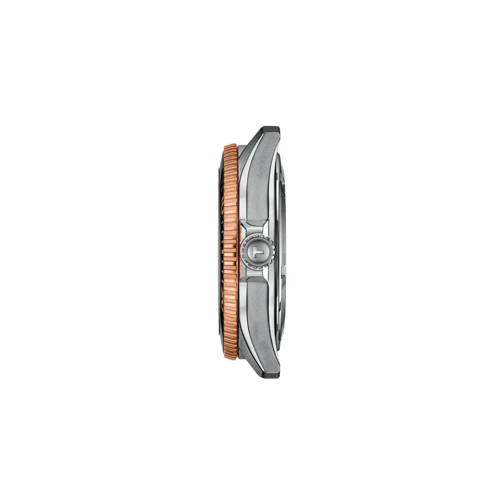 Tissot Seastar 1000 Powermatic 80(T120.807.22.051.01) 以卓越的运动性能与现代优雅相结合。腕表采用 40 毫米 316L 精钢表壳,搭配 双色 PVD 涂层(钢色 + 玫瑰金色),呈现大胆而经典的外观。灰色表盘由 带防反光涂层的蓝宝石玻璃 覆盖,具备极强的抗刮能力和出色的读时效果.