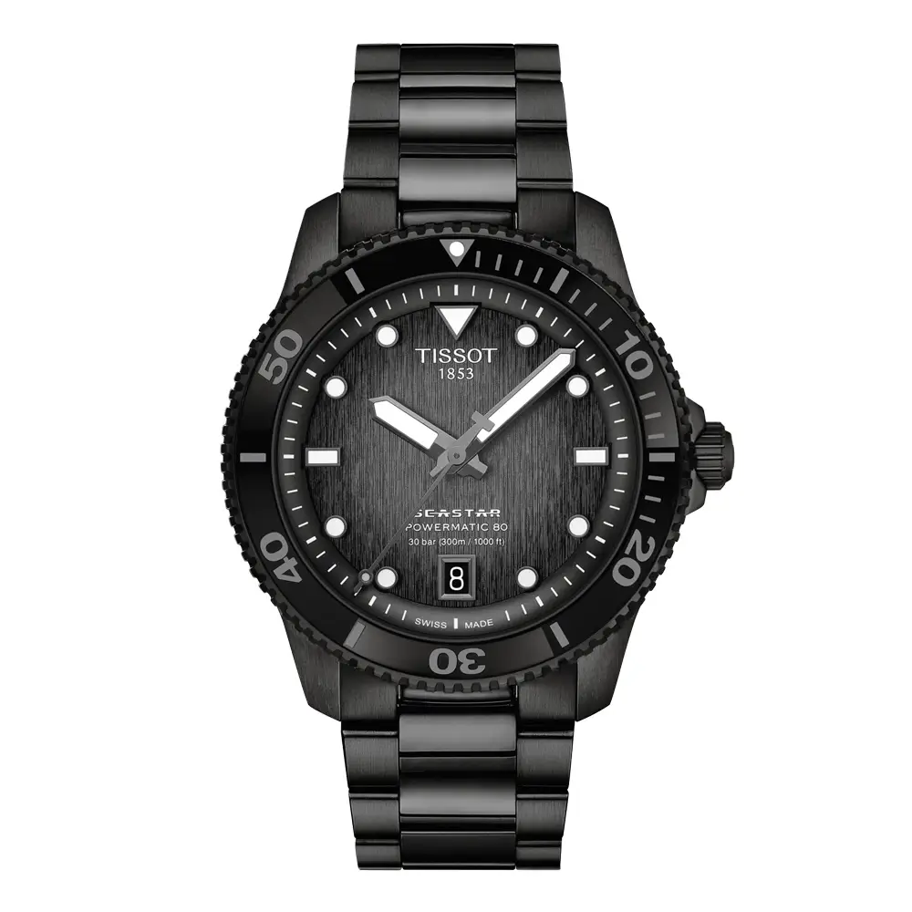 Tissot Seastar 1000 Powermatic 80 T120.807.33.051.00 将现代运动风格与强大耐用性相结合。40 毫米黑色 PVD 钢表壳与 Super-LumiNova® 夜光石墨色表盘确保高可读性与专业潜水风格。单向旋转表圈进一步强化潜水属性。