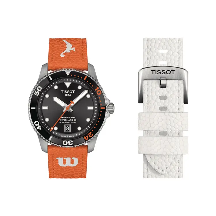 Tissot Seastar Wilson WNBA T120.807.17.051.00 是一款融合运动与优雅的潜水腕表,灵感源自女子篮球的活力。40 毫米圆形不锈钢表壳 搭配 陶瓷表圈,并由 防刮擦蓝宝石水晶玻璃 保护。黑色表盘 配有醒目的 夜光元素 和 6 点位置的日期显示。