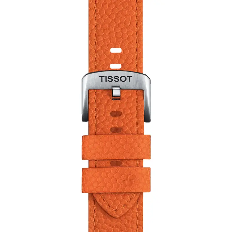 腕表搭配醒目的 橙色皮质表带,配针扣,其质感仿照篮球表面纹理,赋予腕表独特的运动气息。凭借 30 ATM(300 米)防水性能,适合潜水及高强度水上运动。
