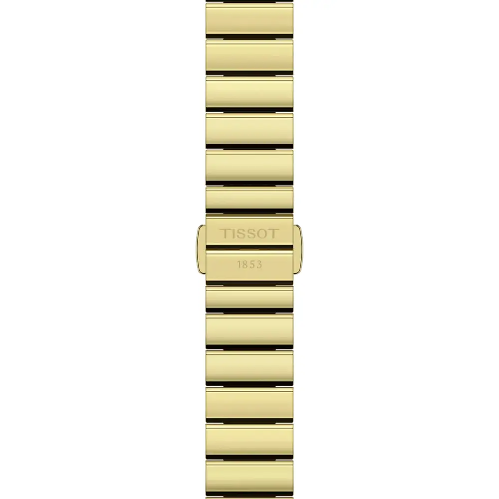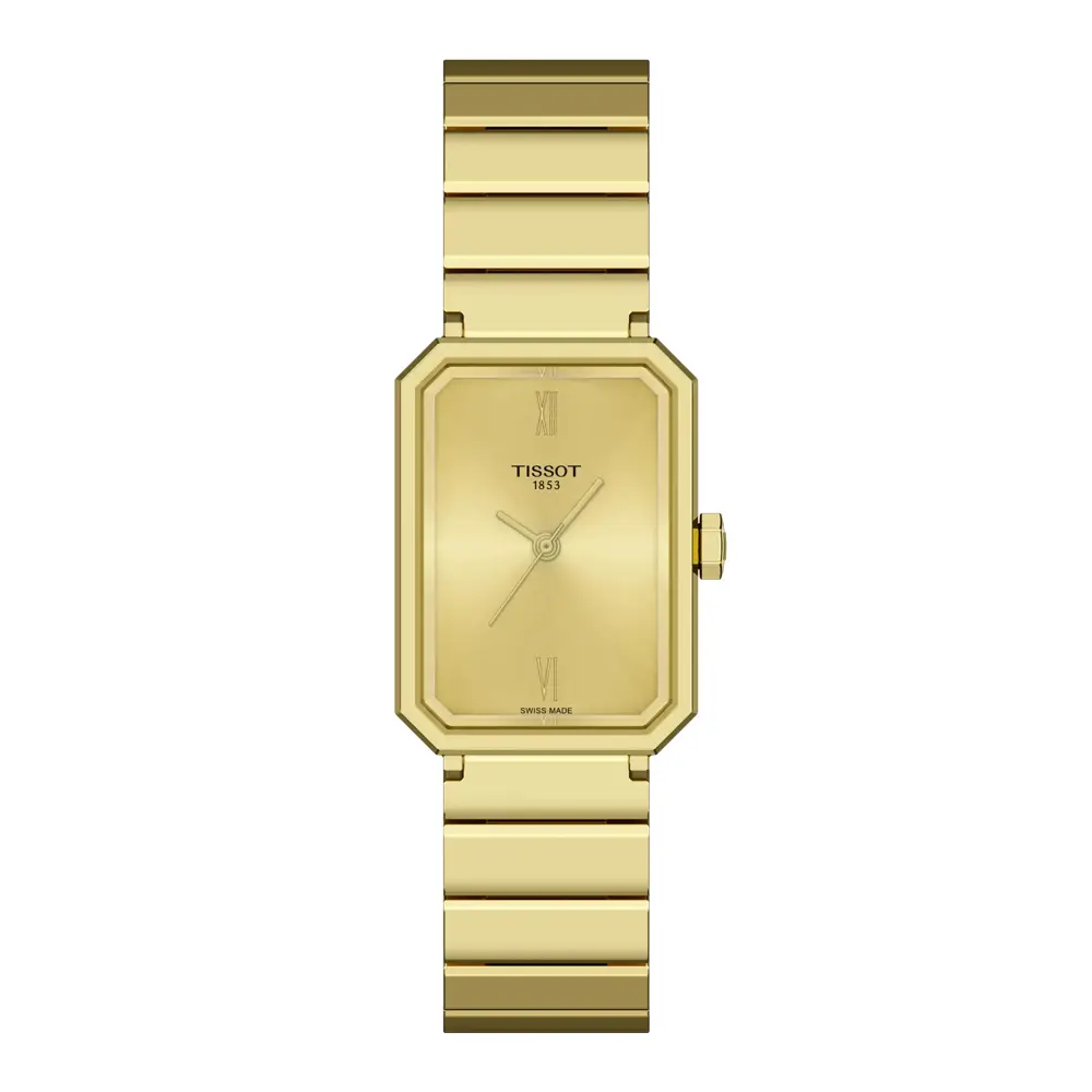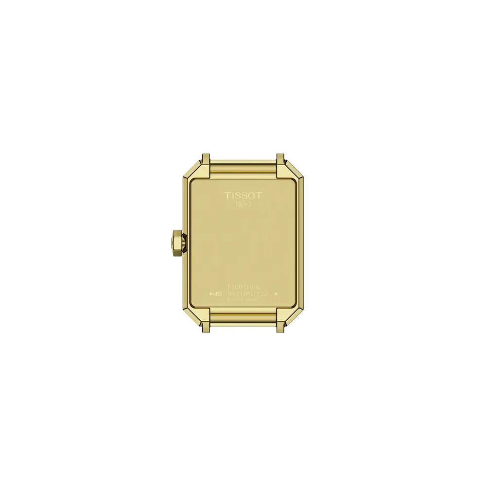 Tissot SRV 30mm 将 1970 年代的设计以优雅方式重新演绎,采用 21.8 × 30 mm 长方形不锈钢表壳并搭配黄色金色 PVD 涂层。蓝宝石玻璃与 5 bar 防水性能确保日常使用的可靠性,而整体金色色调让腕表呈现出珠宝般的精致气质。