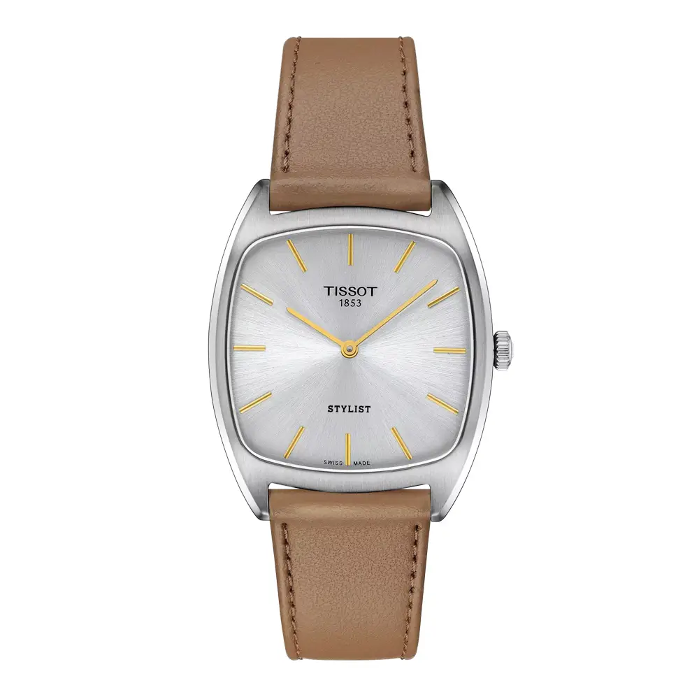 Tissot Stylist 将 现代极简设计 与永恒美学相结合,是一款优雅的中性腕表。其 32 × 32 毫米 316L 不锈钢方形表壳 搭配 银色太阳纹表盘,呈现细腻的光影效果,营造出简洁精致的气质。棕色真皮表带 完善整体风格,使腕表兼具经典与百搭特性,男女皆宜。