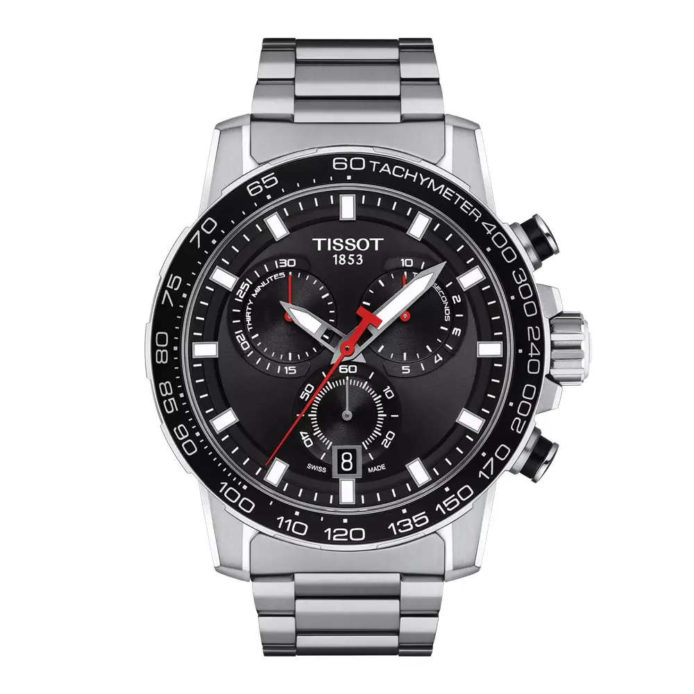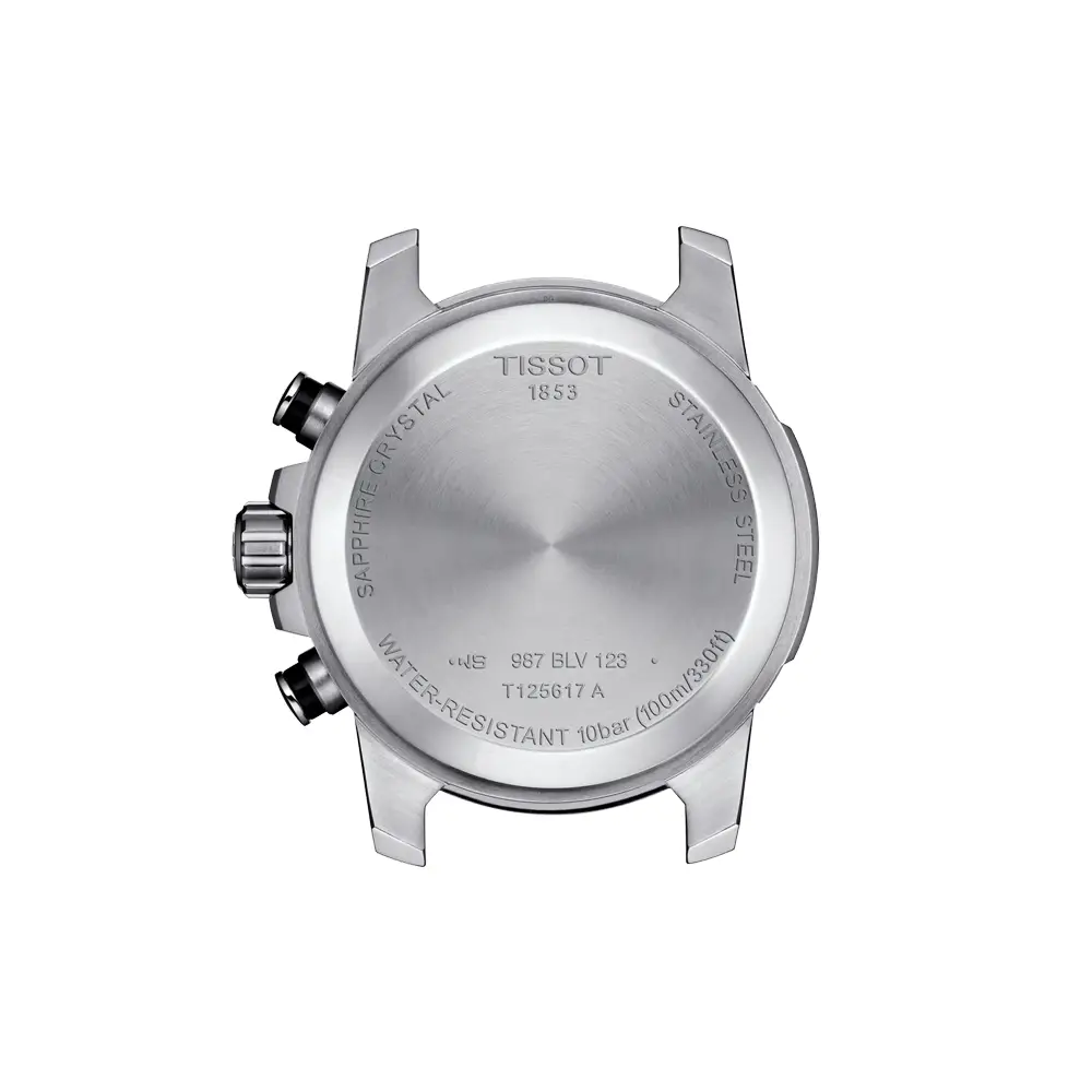 Tissot Supersport Chrono T125.617.11.051.00 将动感运动风格与瑞士精密工程相结合。其 45.5 毫米精钢表壳 搭配带测速刻度的黑色铝质表圈,在腕间呈现强劲而醒目的存在感。黑色放射纹表盘搭配镀铬刻度和 Super-LumiNova® 夜光指针,在弱光环境中仍具出色可读性。