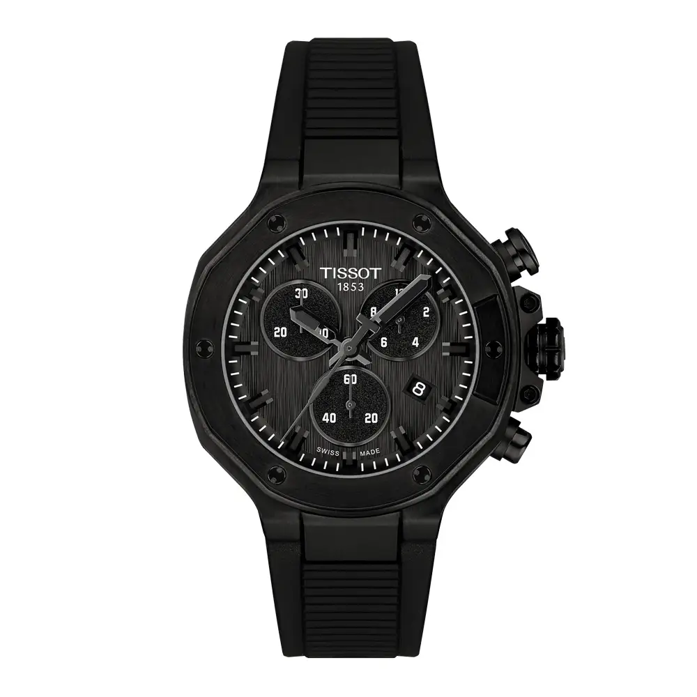 Tissot T-Race Chronograph T141.817.37.051.00 灵感源自赛车运动,体现在动感的表壳线条、醒目的计时按钮以及运动风格的表盘布局中。黑色 PVD 表面处理使腕表更具现代感,适合日常佩戴及活力场景。