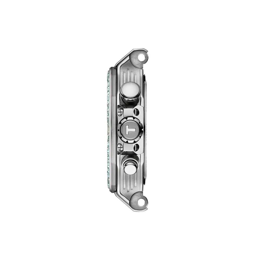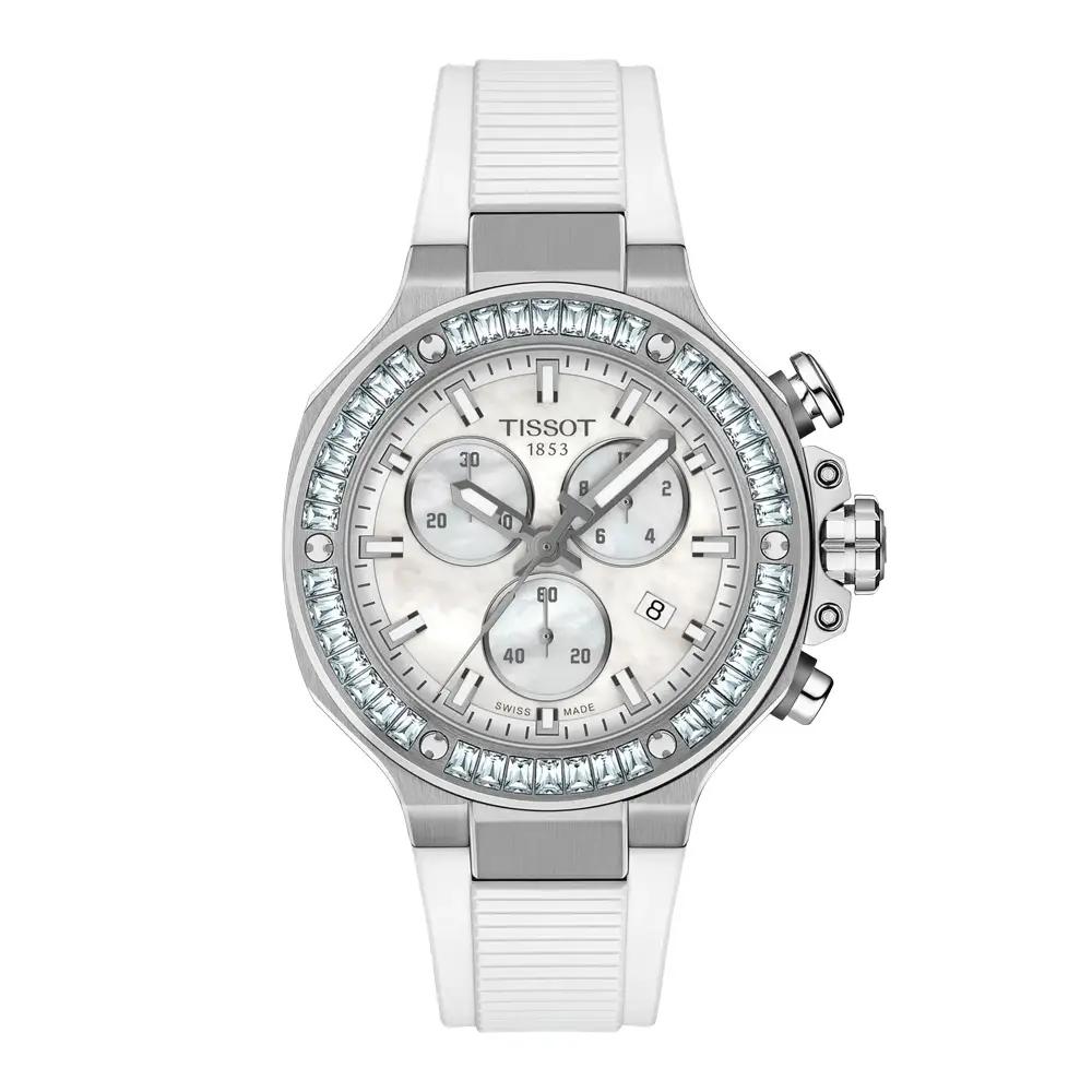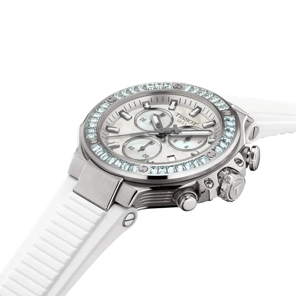 T-Race 腕表将 赛车灵感设计 与明亮优雅的风格相结合——白色珠母贝表盘搭配 白色硅胶表带,呈现出现代、女性化且实用的外观。316L 不锈钢表壳 与镶嵌闪耀宝石的表圈增添精致奢华感,而表壳的造型细节则呼应 T-Race 系列的动感基因。