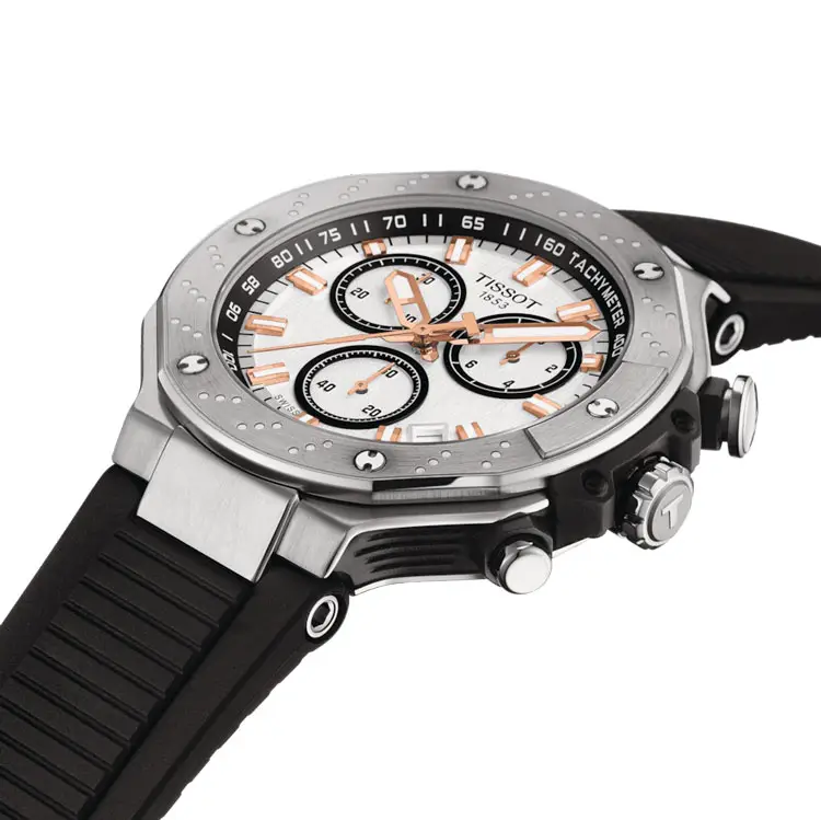 Tissot T-Race Chronograph 是一款男士运动腕表,灵感源自摩托车竞速。腕表采用 45 毫米不锈钢表壳、白色表盘搭配黑色小表盘,设计细节呼应 刹车盘、发动机冷却系统与车把造型。配备 单向旋转表圈、测速刻度与 Super-LumiNova® 夜光指针与时标,展现动感风格。