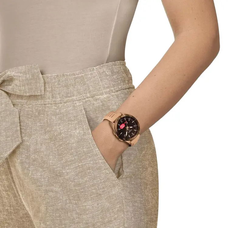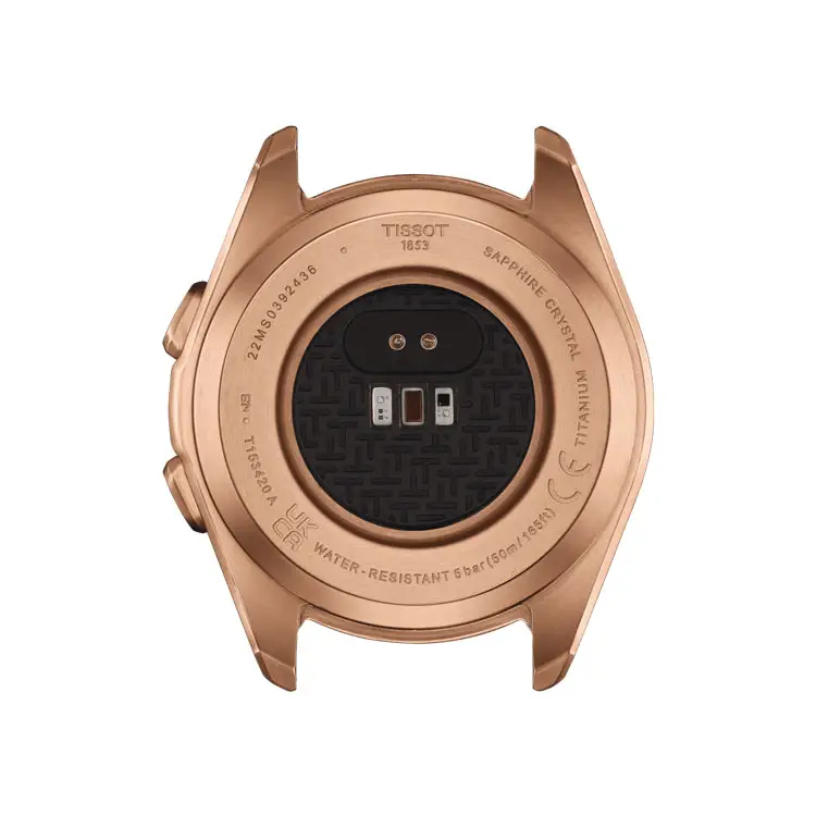 Tissot T-Touch Connect Sport 奢华版融合了运动风格、现代科技与瑞士精密工艺。43.75 毫米圆形钛金属表壳搭配优雅的玫瑰金 PVD 涂层 及 陶瓷表圈,兼具现代感与耐用性。表盘由 防刮擦蓝宝石水晶玻璃 保护。