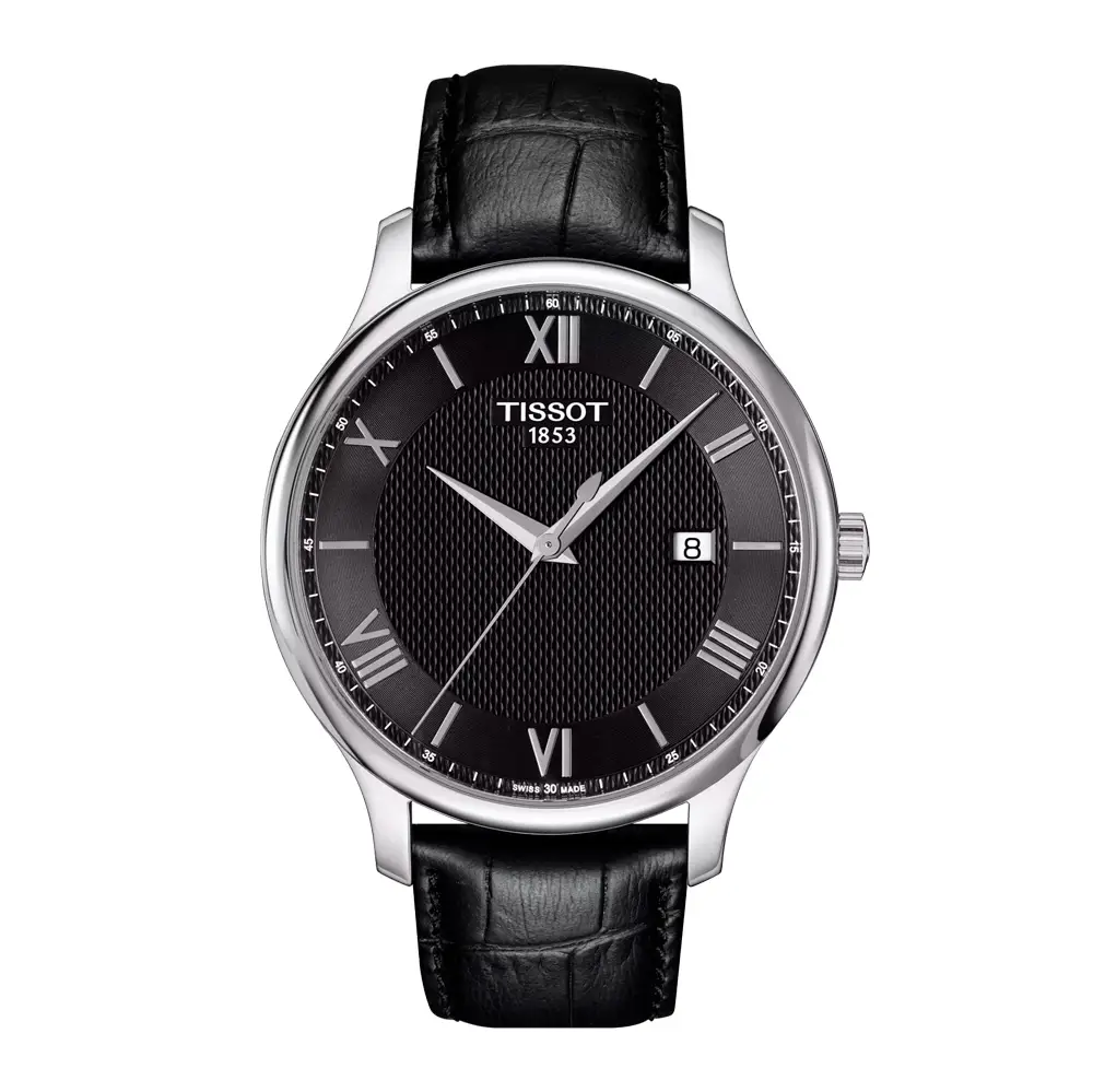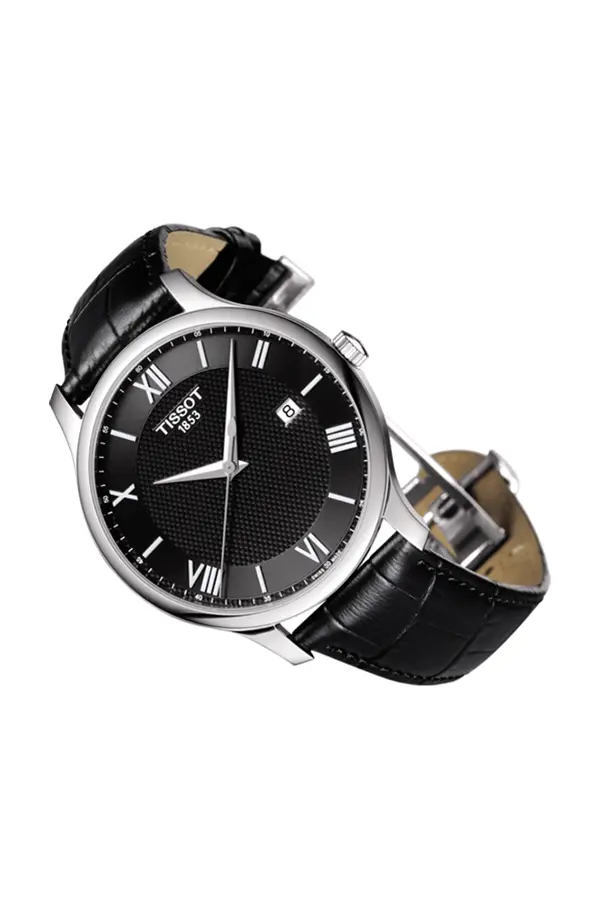 黑色皮表带配经典针扣 让佩戴更加优雅舒适。具备 30 米(3 巴)防水性能 的 天梭 Tradition Quartz T063.610.16.058.00 是追求 典雅、可靠与永恒设计 男士的理想之选,完美诠释 瑞士品质与经典风格。