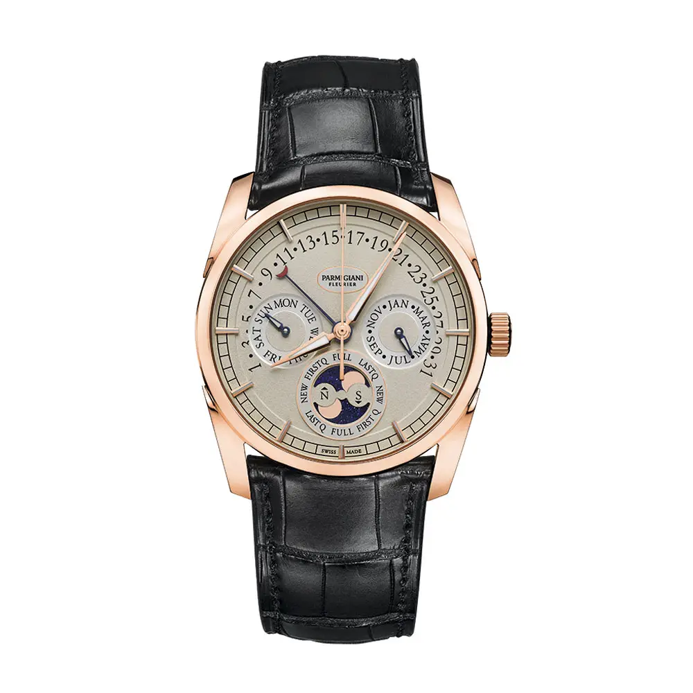 Parmigiani Fleurier Tonda Calendrier Annuel 型号 PFC272-1002401-HA1242 是瑞士高级制表的杰作,完美融合了经典优雅、先进机械工艺与非凡的制表技艺。40 毫米表壳采用 18K 玫瑰金 精制而成,营造出温暖奢华的外观,并搭配 Hermès 手工缝制棕色鳄鱼皮表带。