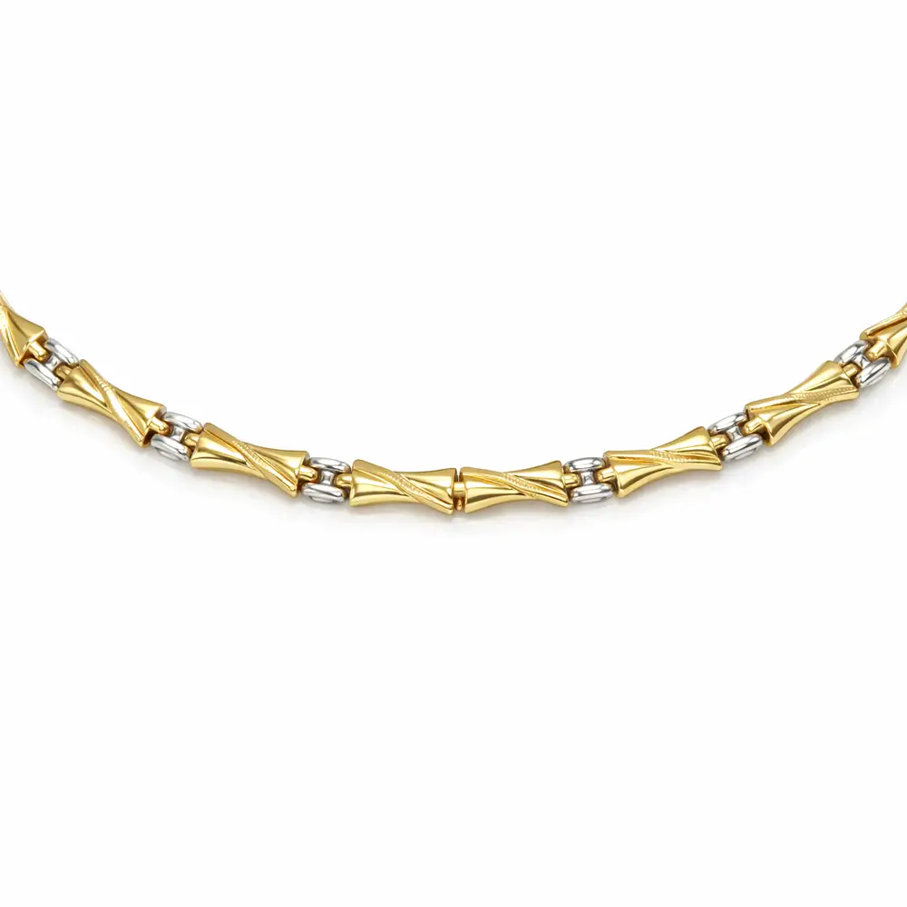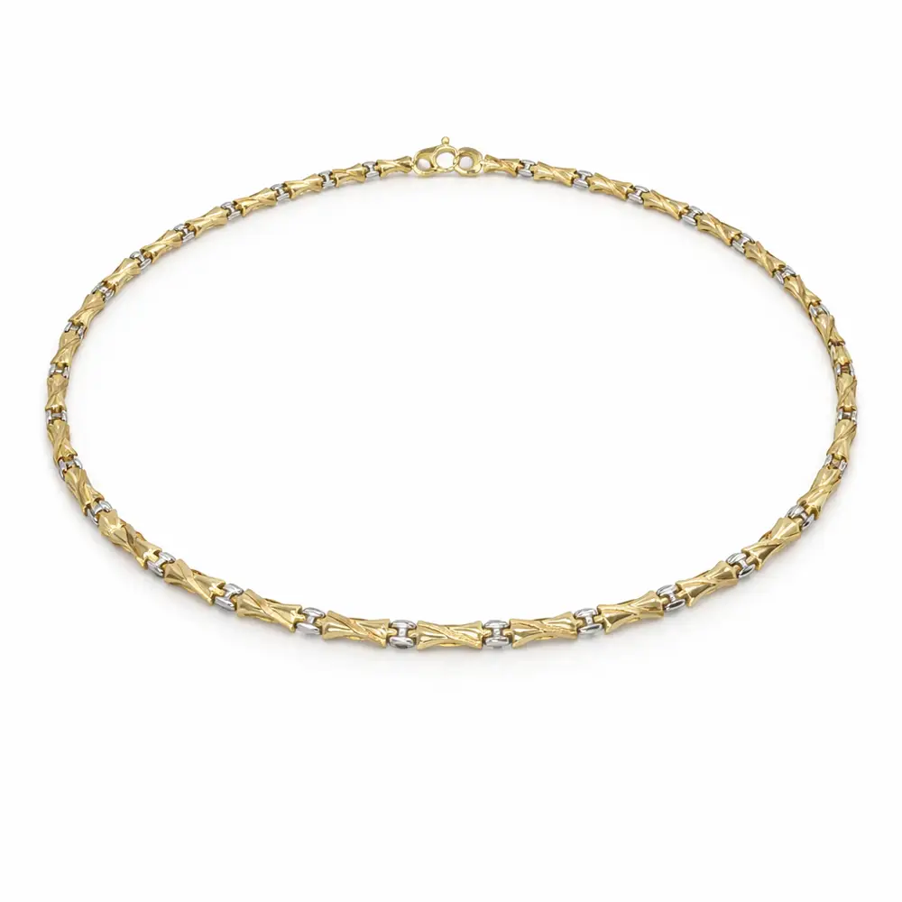 这款优雅的双色黄金项链以简约而永恒的设计脱颖而出,精致的链节巧妙结合了黄金与白金色调。两种颜色的和谐搭配赋予项链现代而精致的外观,细腻的工艺带来流畅的线条与柔和光泽。