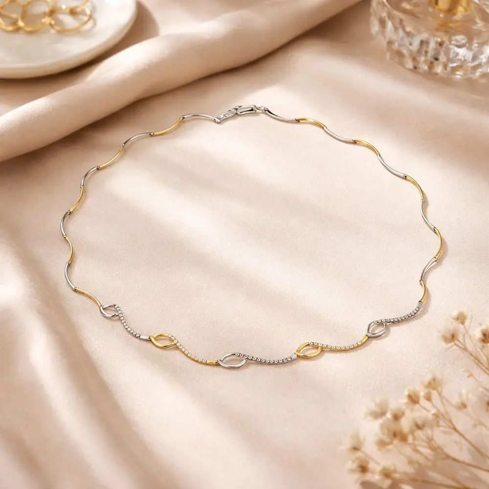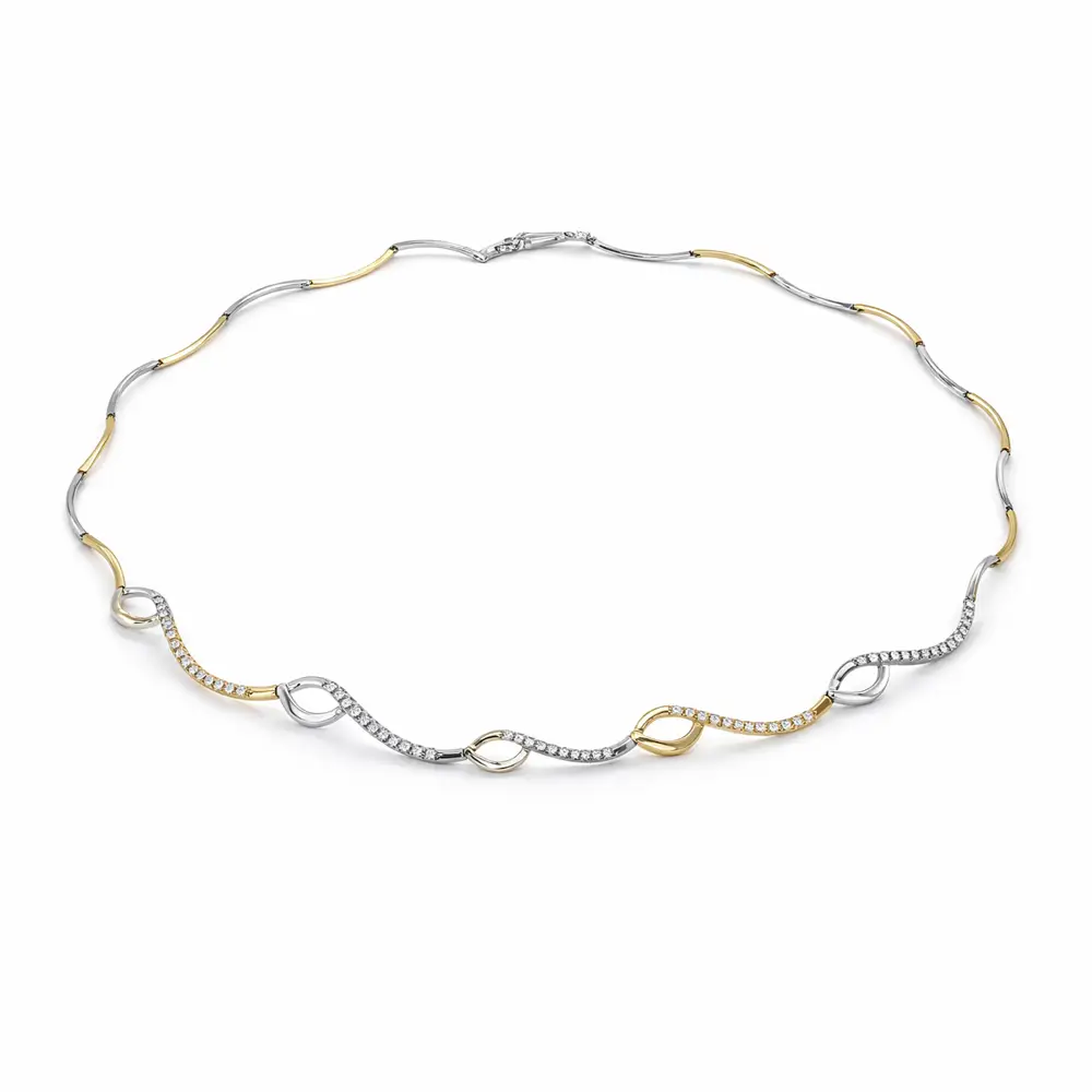 这款优雅的双色黄金项链将黄金与白金巧妙结合,并点缀精致镶嵌的锆石。流畅的波浪形链节设计展现出现代而高雅的气质,锆石柔和反射光线,提升整体的精致与奢华感。