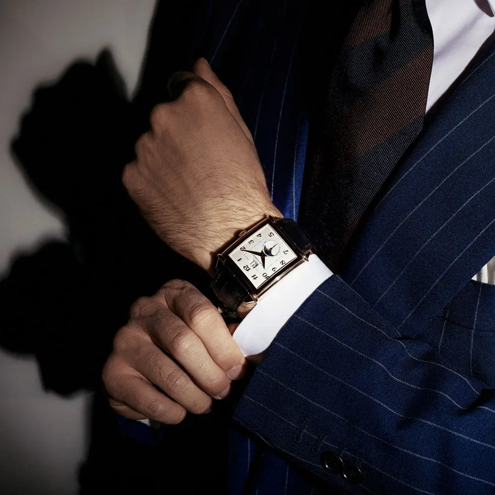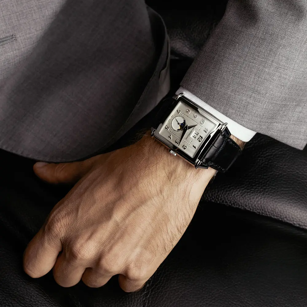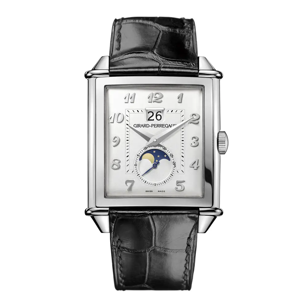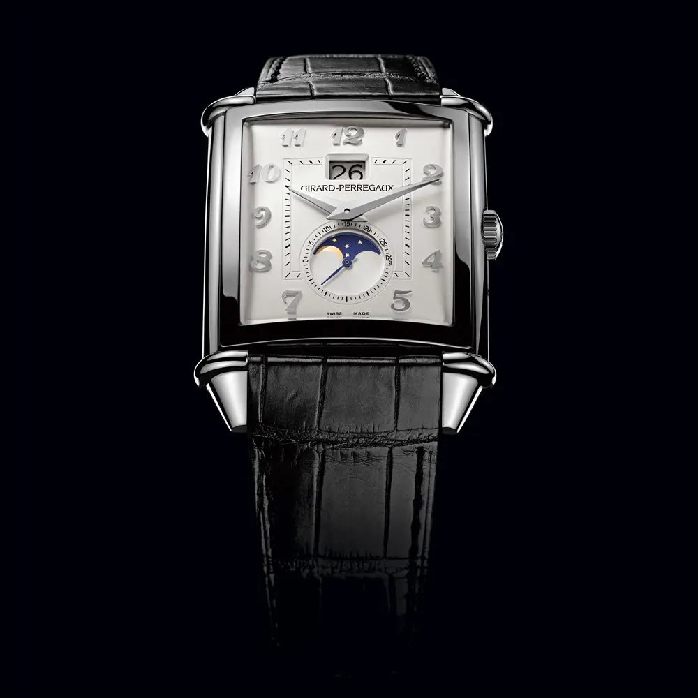Girard-Perregaux Vintage 1945 XXL Large Date and Moon Phases 完美融合了 经典美学与精密工艺。灵感源自 Art Deco 装饰艺术风格,采用 矩形精钢表壳与优雅弧形线条,佩戴舒适且比例协调。
