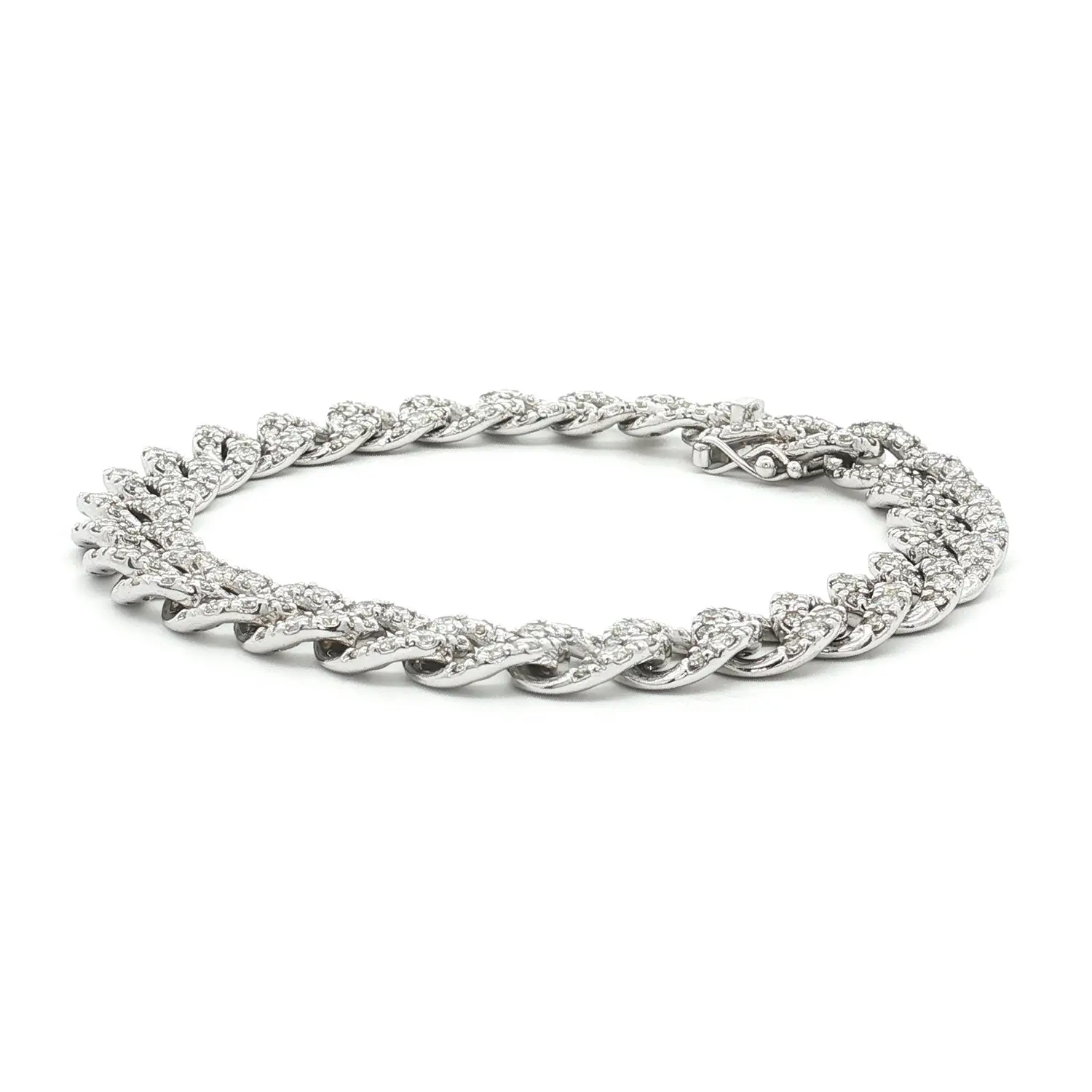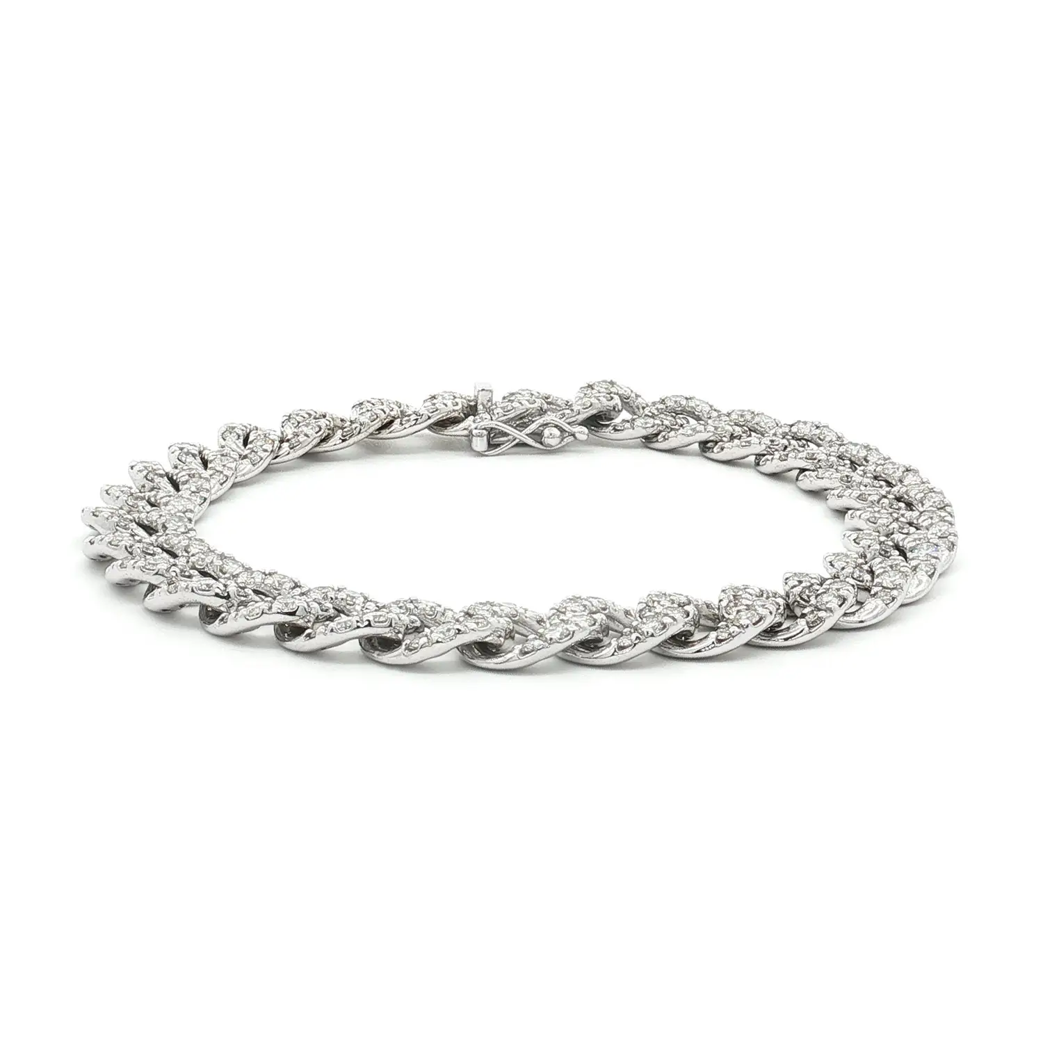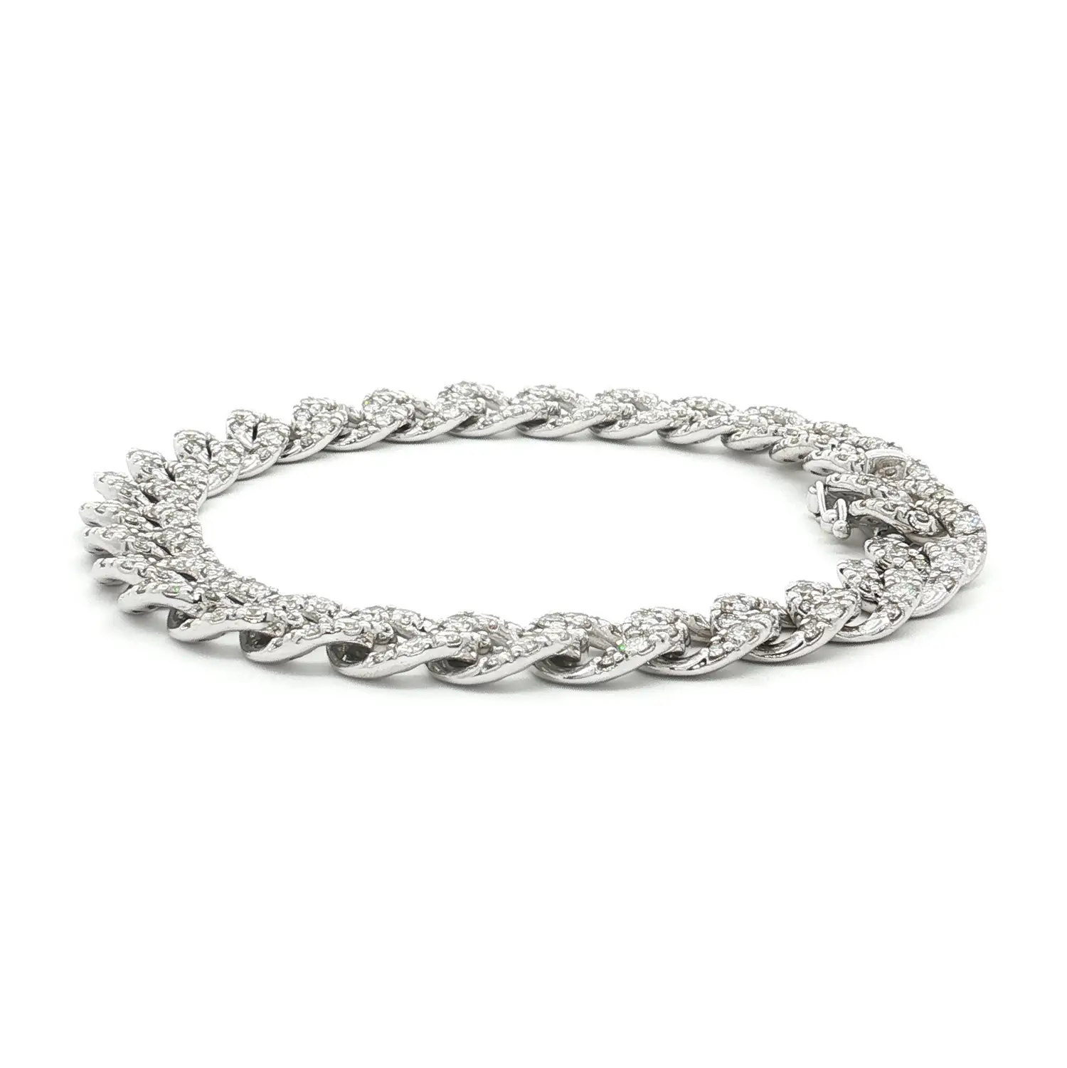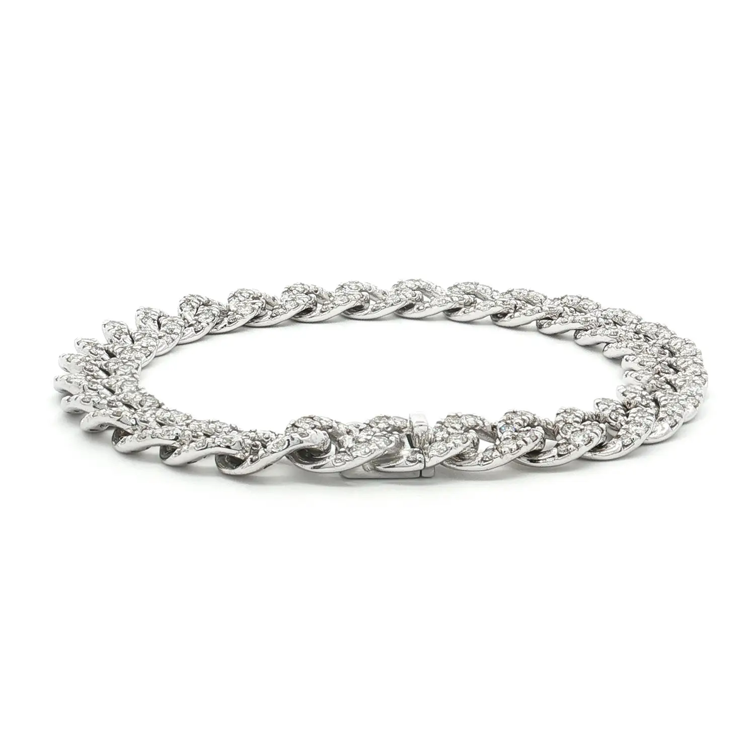 这款白金钻石手链完美融合了现代设计与经典奢华。整体采用链节造型设计,每个链节均镶嵌明亮式切割钻石,闪耀光彩流动不息。每个细节都经过精密打磨,确保佩戴舒适且质感柔滑。