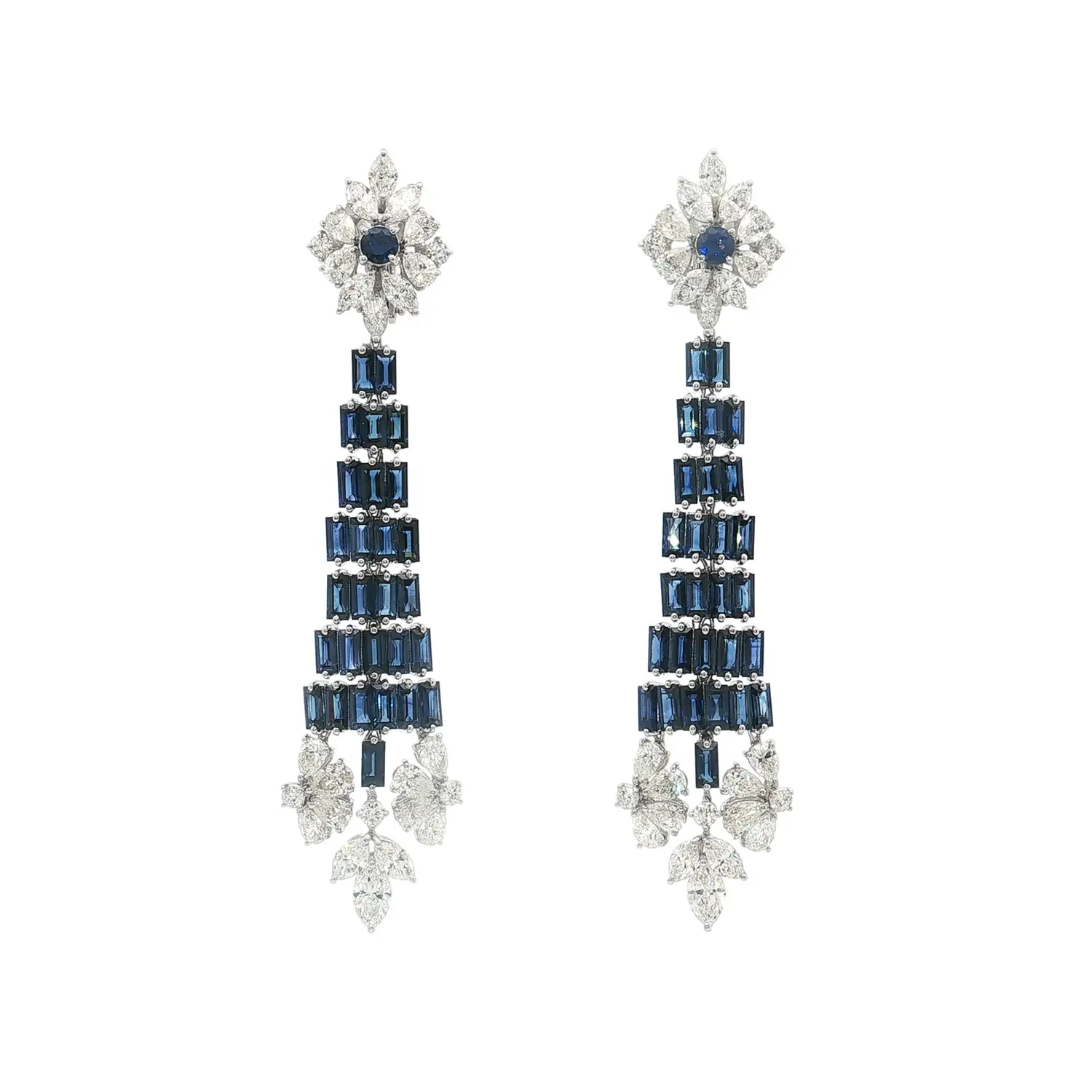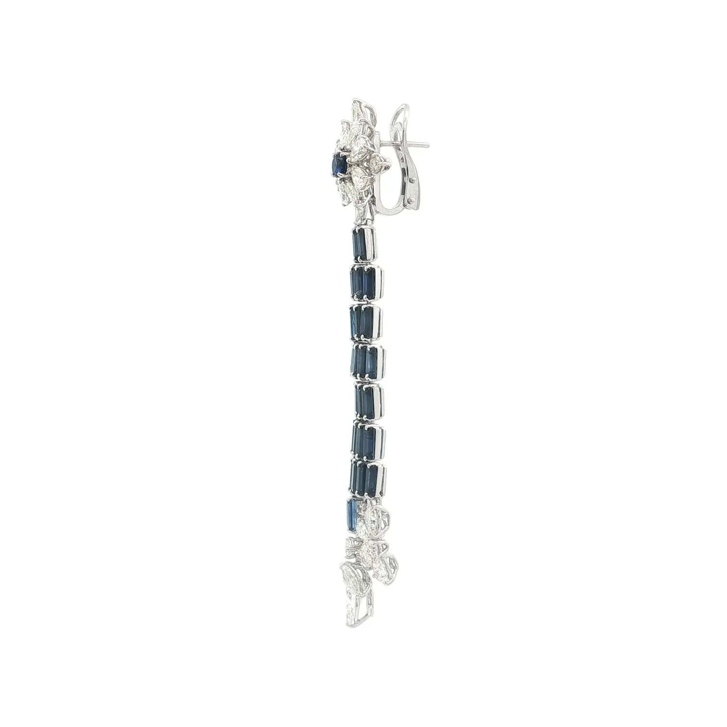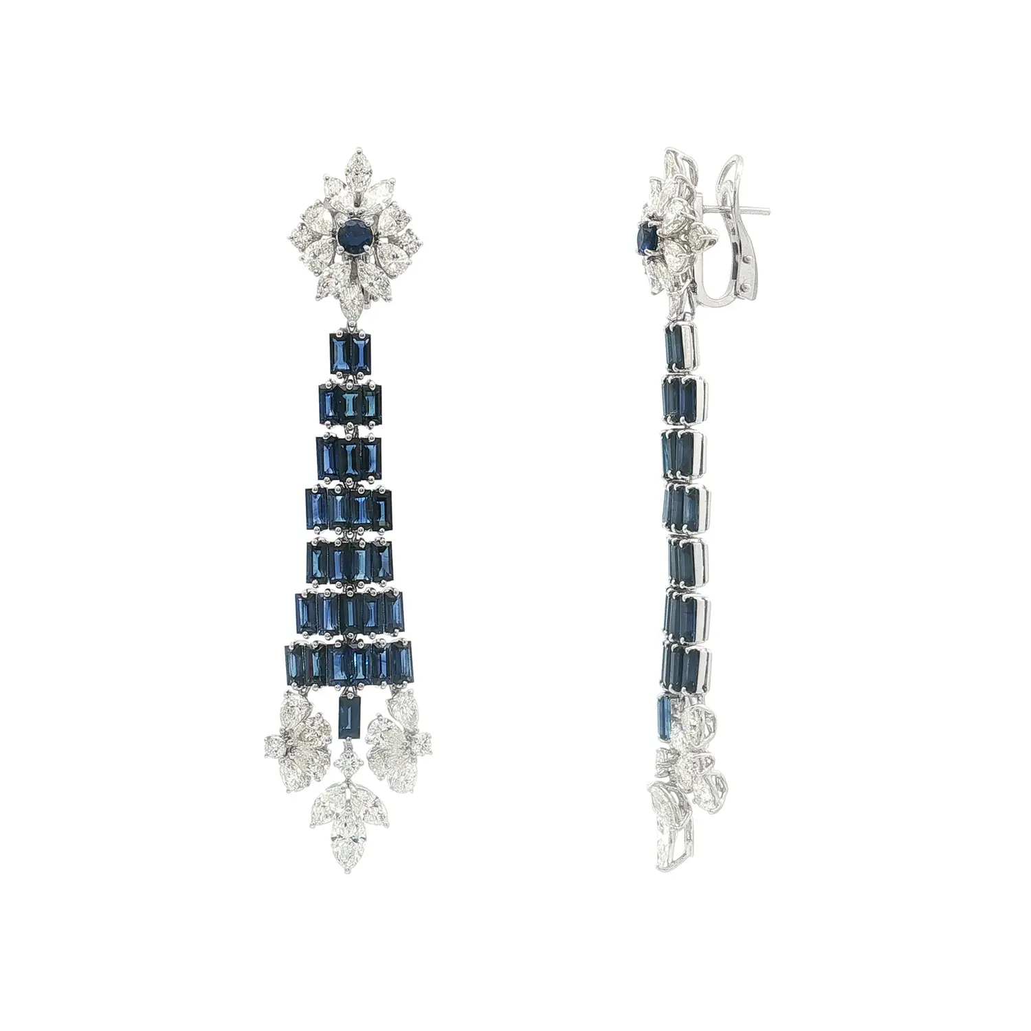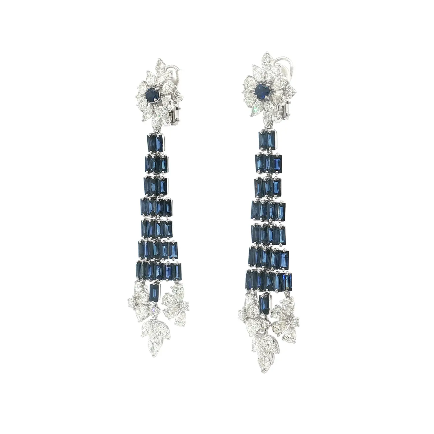 这款白金蓝宝石钻石耳环融合了经典优雅与精湛工艺。深邃的蓝宝石与闪耀的钻石相互辉映,形成迷人的光影对比。上部为花朵造型设计,中心镶嵌圆形蓝宝石,周围环绕钻石,延伸至多层矩形切割蓝宝石。每一颗宝石都经过精细镶嵌,展现纯净与光彩。
