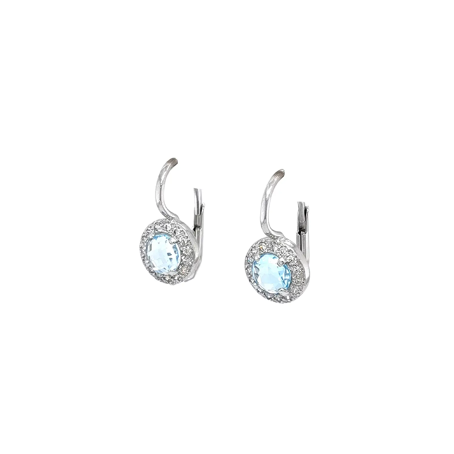 这款由 白金 制作的优雅耳环,以中央的 蓝色托帕石 为焦点,展现清澈而柔和的天蓝色光彩。每颗宝石均镶嵌于圆形外圈,并以闪耀的 锆石微密镶 环绕,进一步增强亮度并突出主石的色彩。
