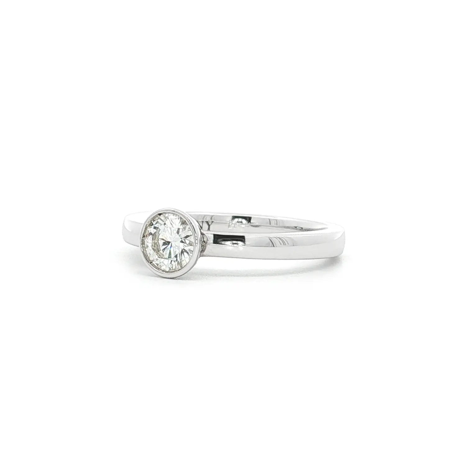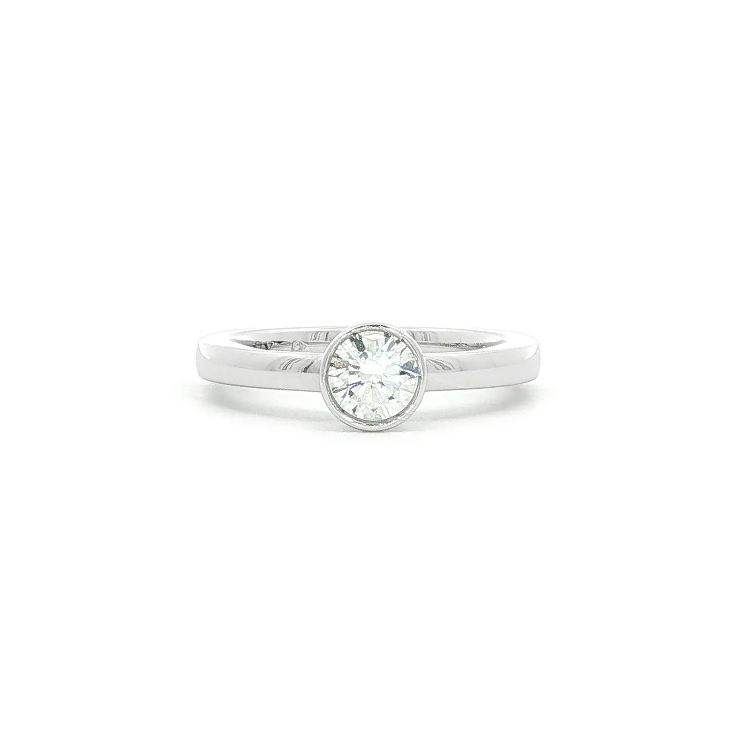这款白金订婚戒指镶嵌一颗0.52克拉明亮式切割钻石,展现出纯粹与优雅的永恒之美。主石采用光滑包镶设计,既安全稳固,又凸显钻石的璀璨光芒。简约的造型让钻石成为视觉焦点,象征着纯洁与坚定的爱情。
