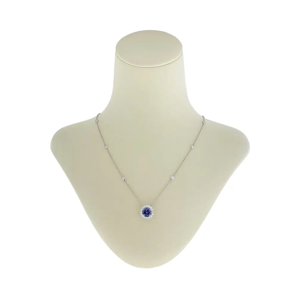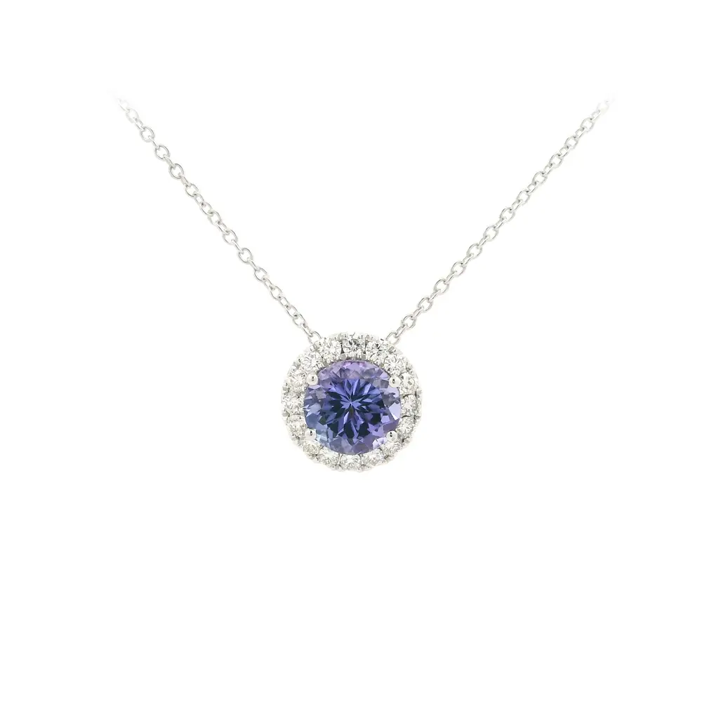 这款 18K 白金坦桑石钻石项链 以简约而优雅的设计著称。中央镶嵌一颗 圆形坦桑石,呈现迷人的蓝紫色光泽,周围环绕 一圈白钻光环,更显高贵闪耀。