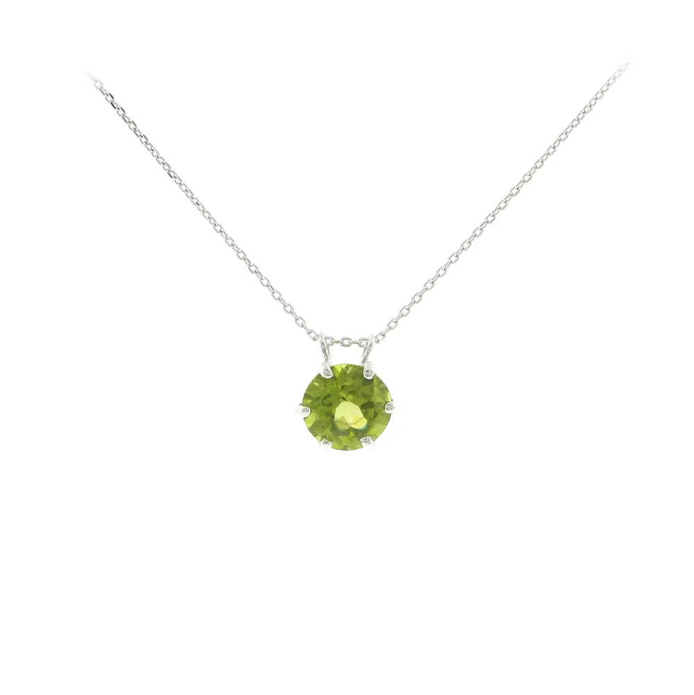 这款 白金吊坠配天然橄榄石 2.00 ct 以清新的色彩和经典优雅的设计吸引目光。吊坠中央镶嵌一颗圆形切割橄榄石,并采用 六爪镶嵌 固定,使宝石更加稳固,同时充分展现其自然光泽与色彩。白金材质 的简约设计更突显宝石的美感。