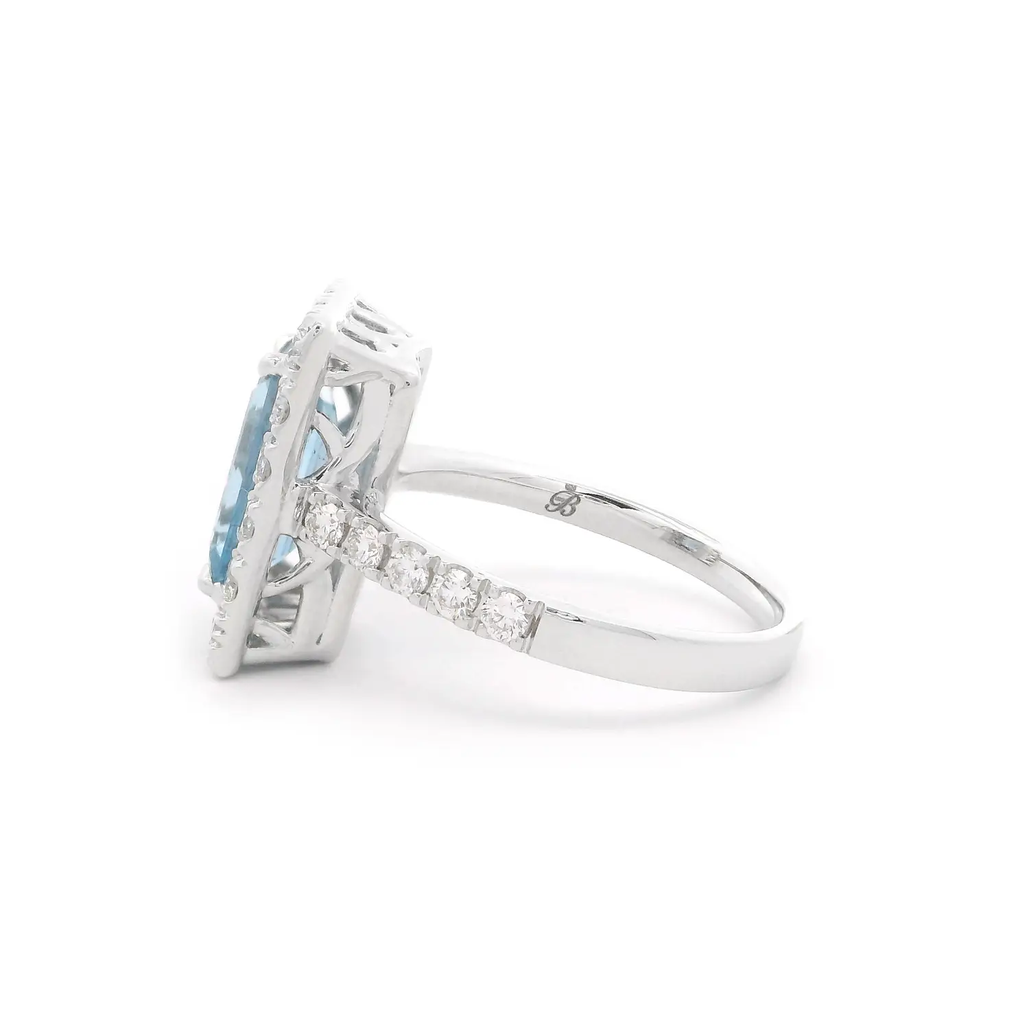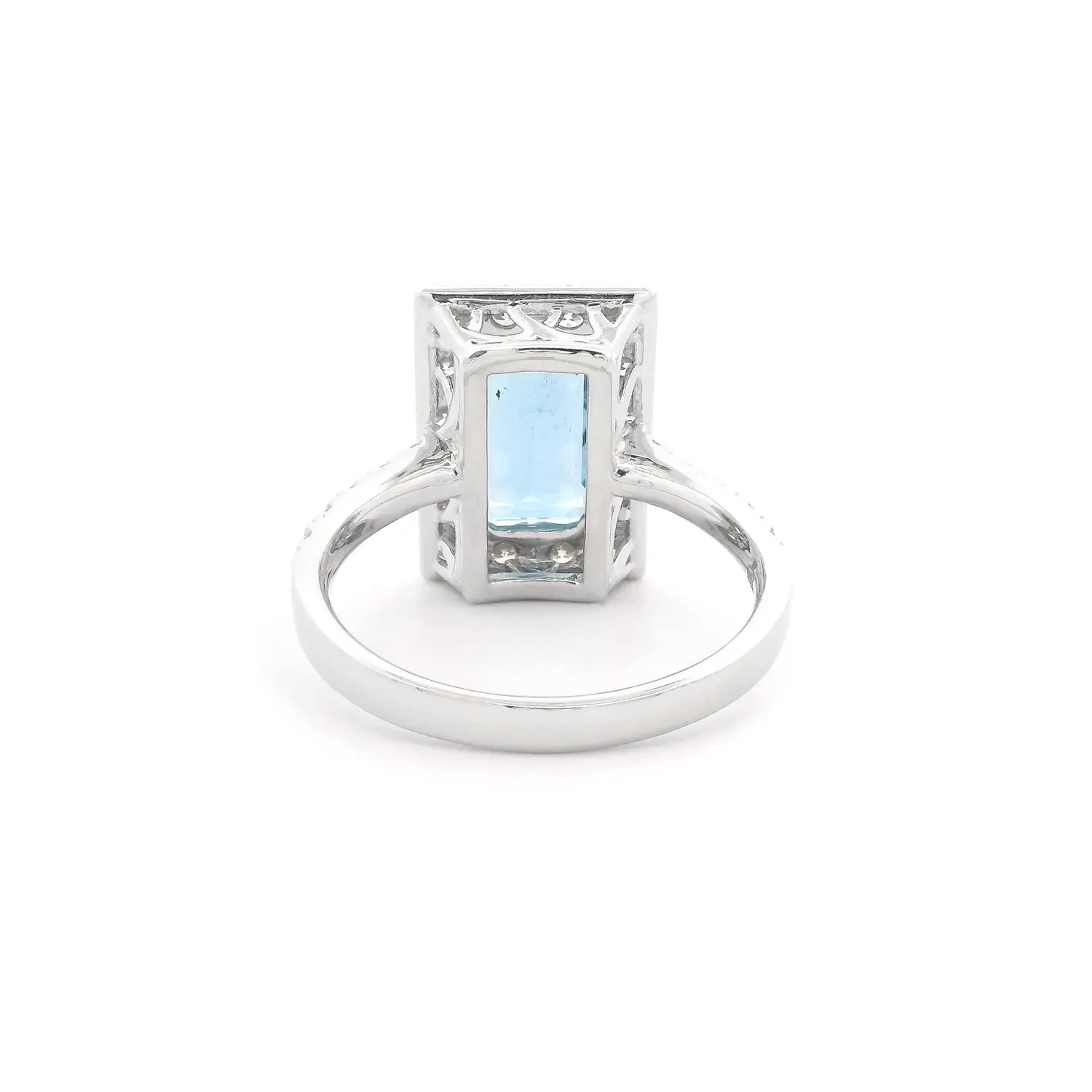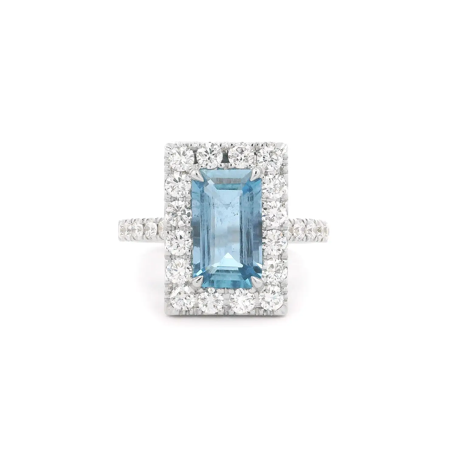 这款白金海蓝宝石钻石戒指完美融合了精湛工艺、优雅比例与宝石的天然之美。中央镶嵌一颗矩形切割海蓝宝石,色泽清澈如海,象征宁静、勇气与纯净。周围环绕双层明亮式切割钻石,随手指动作闪耀光芒,衬托出海蓝宝石的晶莹光彩。钻石的精确排列呈现出立体的深度与光影变化,而沿戒圈延伸的镶钻设计更为整体增添了连续的闪耀与非凡的优雅。