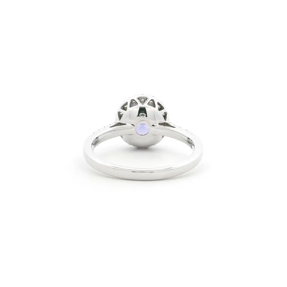 这款 18K 白金戒指 展现出 优雅与奢华的完美平衡。中央镶嵌一颗 圆形坦桑石,其蓝紫色调在光线下变幻,散发迷人光彩。