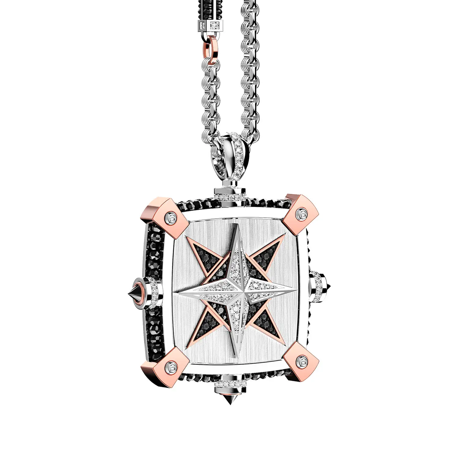 Zancan Black Magic Magnum 项链融合了大胆设计与意大利精湛工艺。厚实的吊坠采用 18K 双色黄金 制成,饰以标志性的星形图案,并镶嵌顶级钻石。整件作品共镶嵌 13.63 克拉黑钻,与 1.31 克拉白钻 形成鲜明对比,呈现出 Black Magic 系列独特的光影效果。