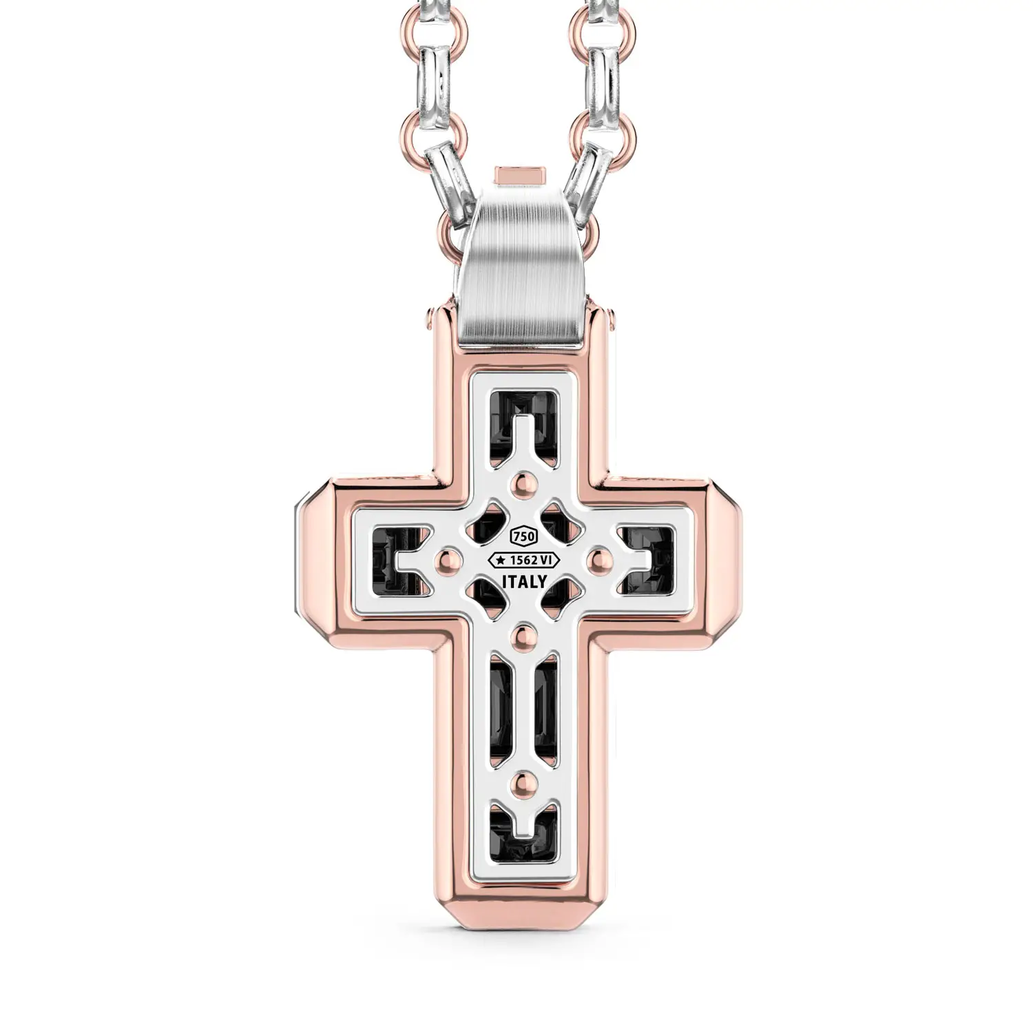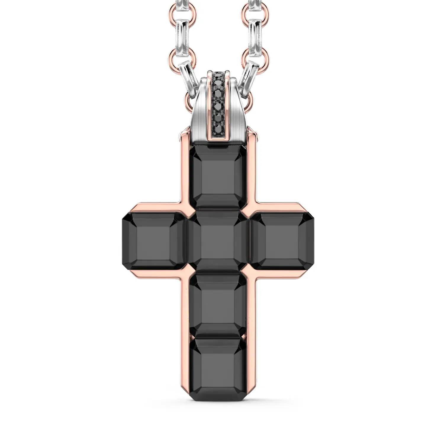 这款独特的 Zancan Couture Black Diamond Cross 项链以大胆的美学设计脱颖而出,将现代风格与精湛的意大利珠宝工艺完美融合。十字形吊坠由 18K 玫瑰金与白金组合打造,并镶嵌令人惊叹的 10.59 克拉黑钻,其深邃的光泽赋予作品力量、个性与无法忽视的视觉冲击。几何排列的宝石形成完美对称,而白钻点缀进一步提升了整体的光感与层次。
