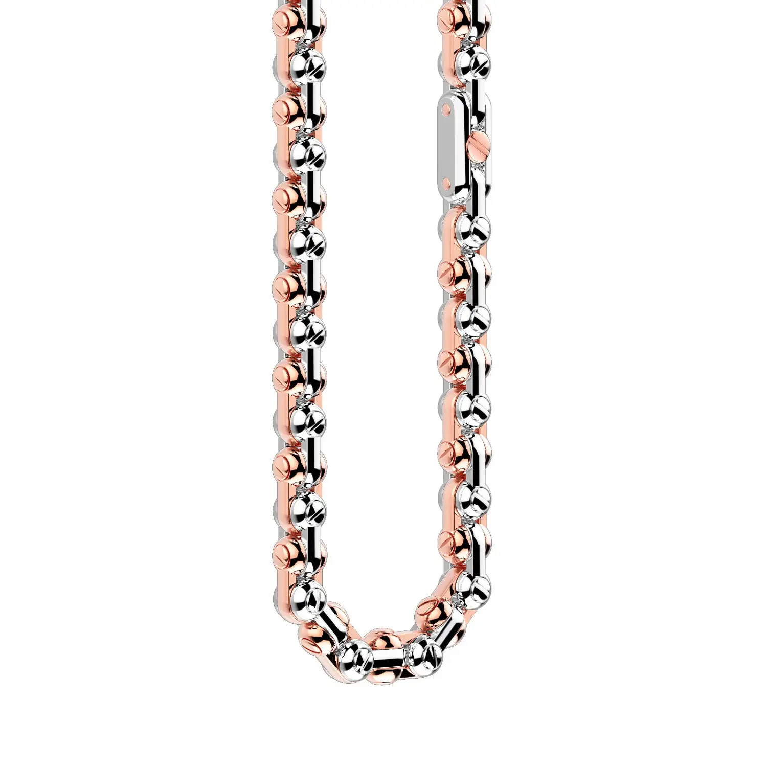 这款 Zancan 男士项链以大胆的结构美学脱颖而出,将 18K 玫瑰金 与 18K 白金 结合为充满力量感与精致技术风格的链节设计。每个链节均精细打造为坚实的圆柱形,并连接成稳固的链条,完美体现品牌一贯的奢华、力量与现代优雅。